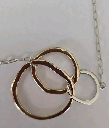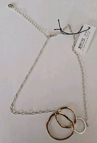 This Sale is for One (1) Howard's Necklace Silver in Color Chain Three (3) Circle Necklace (36756) Intertwined circles ~ 1 Silver 2 Gold Measures approximately 8" long when clasped on first hook (3" Extender) Largest circle measures approximately 1.5" length x 1.5" wide Simple necklace to add to any outfit Steel Chain ~ Zinc Casting Lobster claw style clasp This necklace is new with tags Please view photos for a good description of this necklace Thank you!
