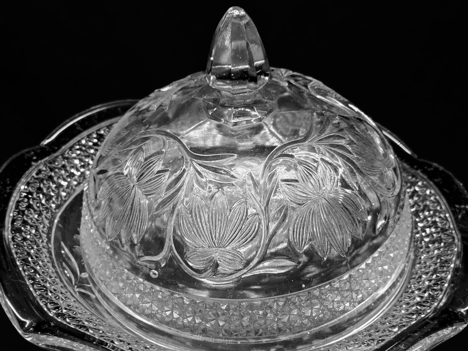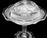 Gorgeous and hard to find Rose Point Band ruffled butter dish/compote by Indiana Glass in excellent condition. Great clarity,