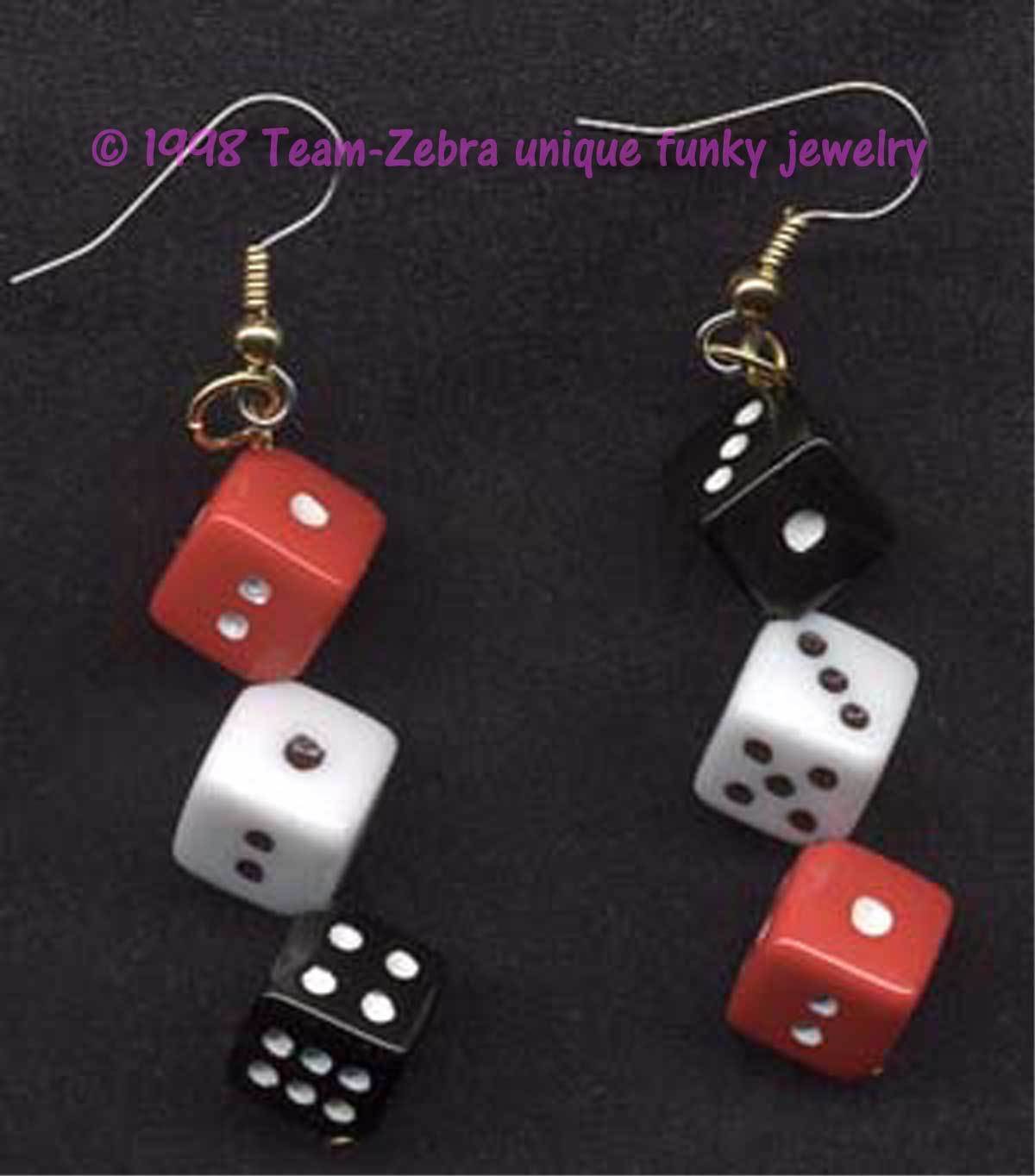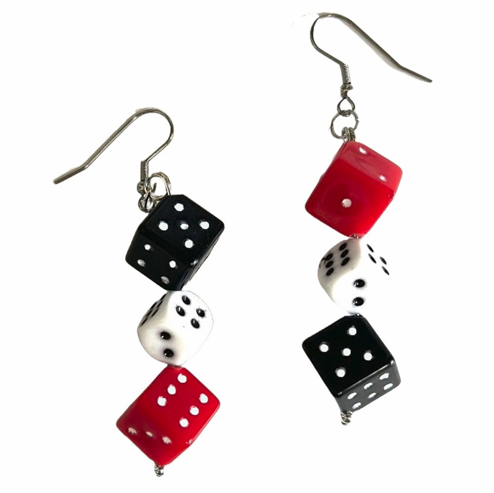 HUGE DICE Funky EARRINGS - Big Realistic Lucky Pair Casino Craps Game Las Vegas Gambler Costume Lucky Charm Novelty Jewelry - Large (slightly smaller than life size) RED BLACK and WHITE Acrylic Solid Plastic Mismatched (Opposite) Charm Beads approx. 2-inch (5cm) total length without earwire. Each 3-dimensional outer dice bead is approx. 1/2-inch (12mm) and center bead is approx 9mm diameter. Great for your favorite player. Mama, Daddy, Baby needs a new pair of shoes! Add some luck to your outfit with these HUGE DICE Funky Earrings from Team-Zebra. The red, black, and white acrylic charms measure 2 inches in length and are shaped like casino dice, perfect for the gambling/casino or steampunk-themed event. The surgical steel hooks are nickel-free and reversible, ensuring maximum comfort and style. Personalize these earrings by entering "CLIP-ON" in the designated box if you prefer a non-pierced option. These drop/dangle earrings make a great gift for any occasion, such as engagement, graduation, anniversary, Valentine's Day, Mother's or Father's Day, or even a birthday. The 3-dimensional design and diagonal stacked setting style make them unique and eye-catching. Get lucky and show off your personality with these fun earrings! SKU: TZ-01249 ---------------------------------------------------------------------------------------------------- Combined Discounts: Buy *$50.00 or more First Class WorldWide shipping is FREE !!! ***Proudly Made in the USA!!!*** ----------------------------------------------------------------------------------------------------