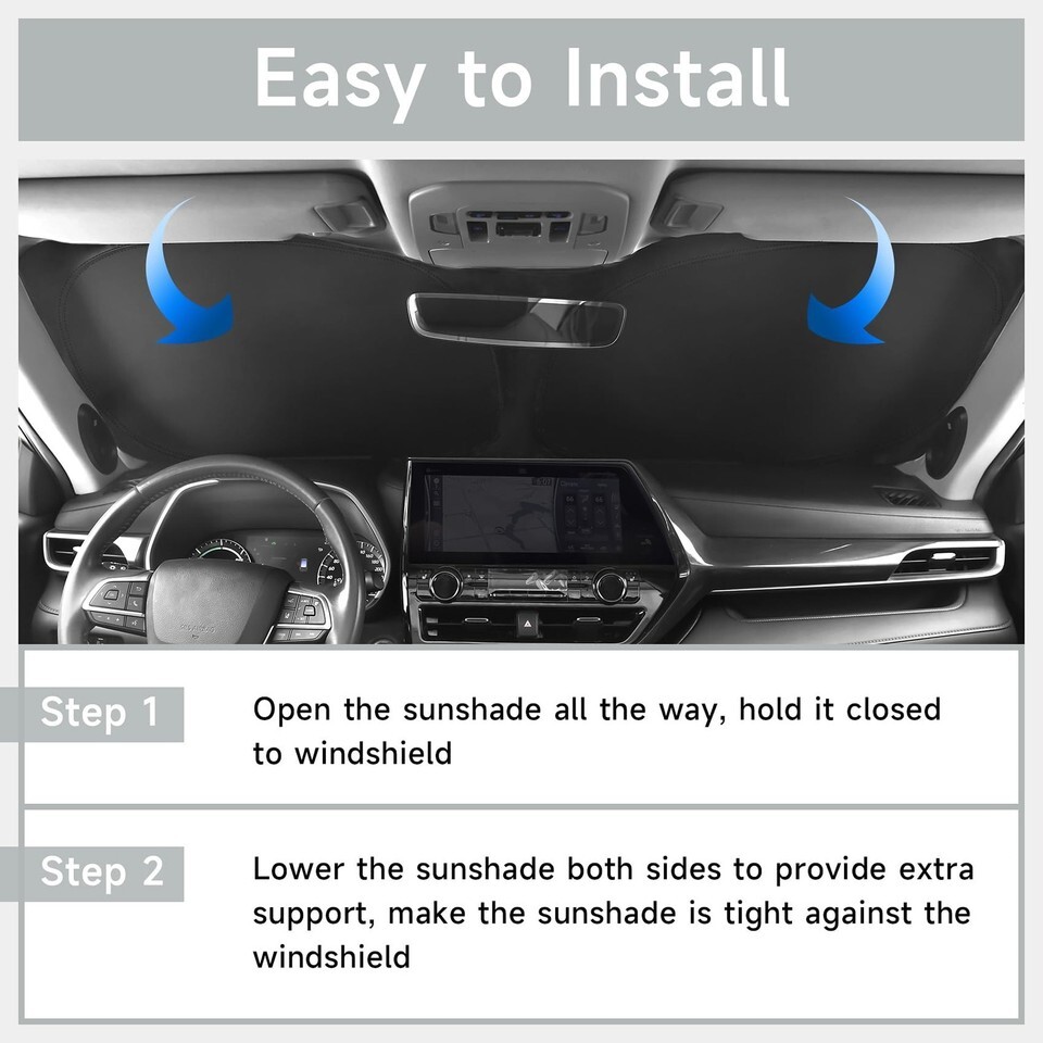 Easy to InstallTruly easy to install and to use. Firstly, Open the sunshade all the way, hold it closed to windshield; and then Lower the sunshade both sides to provide extra support, make the sunshade is tight against the windshield.