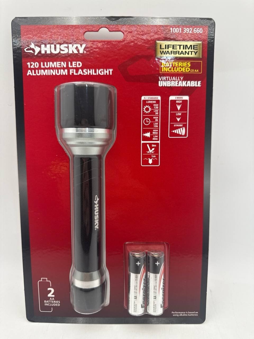 Item includes: Please note: This item includes 1x Husky 120 Lumens Virtually Unbreakable Flashlight, 2X Batteries Only ? As Pictured. No other accessories are included.