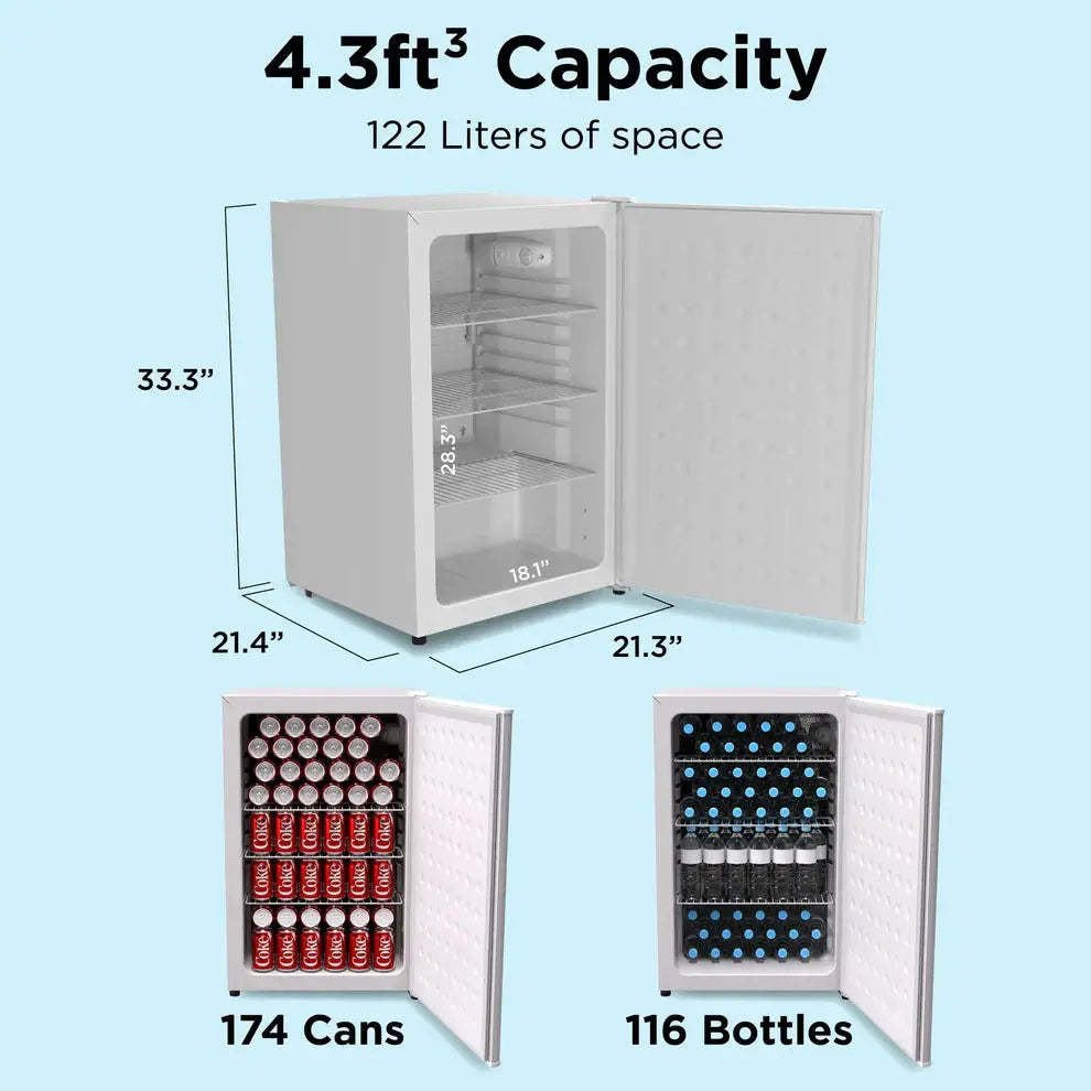 Capacity: 4.3 cu ft. / 122 Liters / 174 Cans / 116 Bottles
