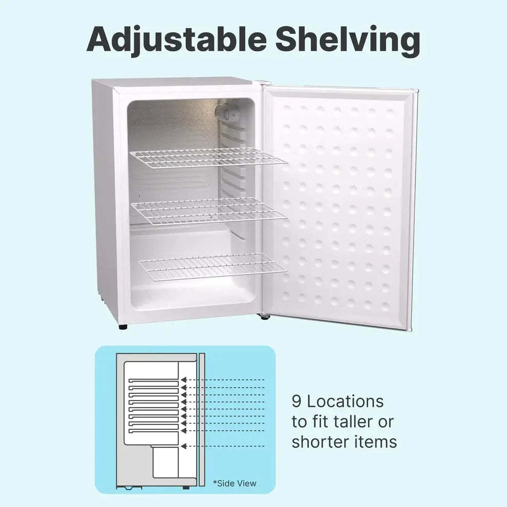 Introducing the Husky 122L Solid Door 4.3 C.ft. Freestanding Under-Counter Mini Fridge, a great solution for any home or office! This under-counter mini fridge offers an impressive capacity of 4.3 cu ft/ 122 Liters/ 174 Cans/ 116 Bottles, making it the perfect size to store all of your favorite beverages and snacks. Its reversible door allows you to open it from either the left or right side, while its adjustable feet keep it stable no matter where you place it. Temperature is easily adjustable between 32-50 degrees Fahrenheit with a low noise level at 40dB. The refrigerator also features three full size and one half size adjustable wire shelf as well as one wine bracket for even more storage options. On the inside, an LED bulb provides illumination for better visibility. The energy efficient and well-insulated design results in a total annual energy consumption of only 205Kwh. With its solid door and modern design, this mini fridge will look great in any setting.