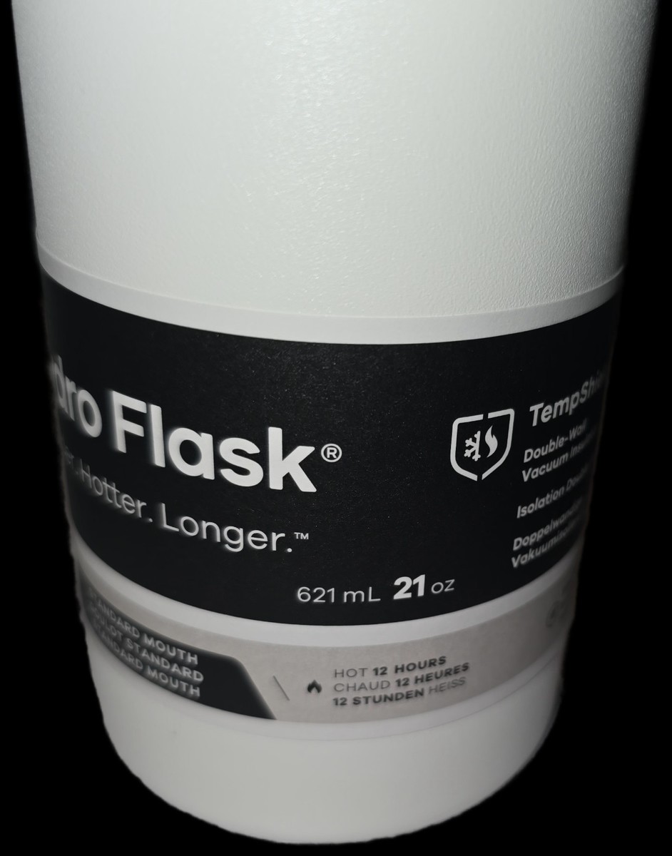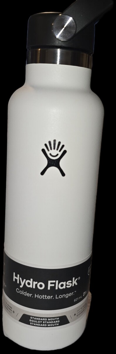 Has a small ding on bottom. SEE PICS The Hydro Flask 21 Oz Standard Mouth Flex Cap in white is a stylish and functional water bottle made of stainless steel. It features a screw-on lid, double wall insulation, and a graphic print of a sport and hiking theme. Perfect for camping and hiking adventures, this water bottle can hold up to 22 fl oz of water and is personalizable to suit your needs. With the trusted brand of Hydro Flask, this water bottle is a must-have for staying hydrated on the go.