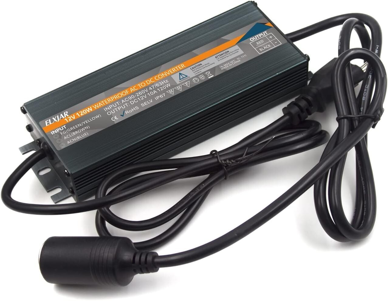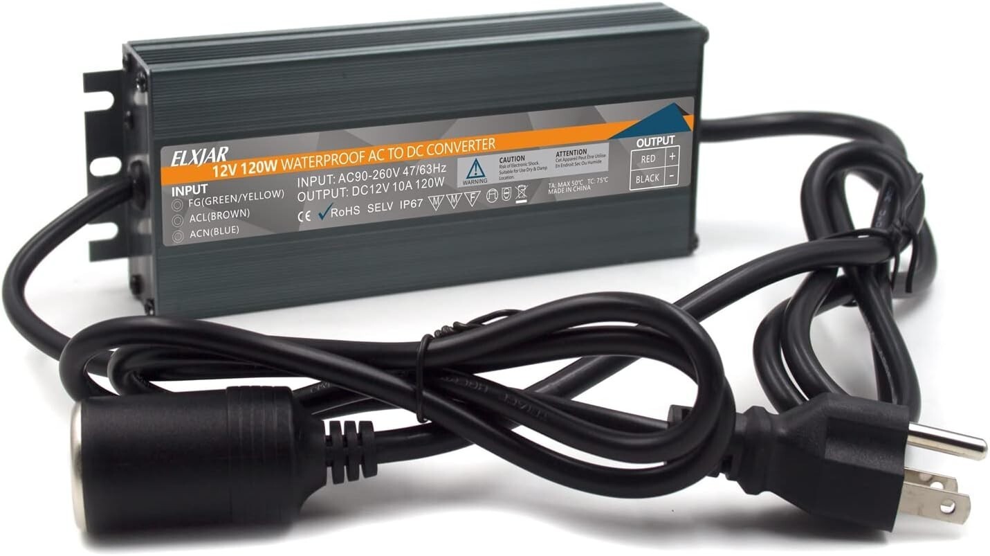 IP67 Waterproof AC to DC Converter, 10A 120W / 110V to 12V Converter - ELXJAR 12V AC to DC IP67 Waterproof Converter. IP67 Waterproof Converter is safer when outdoors, Integrated design of wire and body. High Efficiency Reliability, Automatic Overload Cut-off, Automatic Thermal Cut-off, Short Circuit Over Voltage Protection, Low Interference Noise. Connected to AC 90~260V 47/63Hz household current and convert into DC 12V 10A power with a total long 254cm (8.3ft) power cord to reach a wide range. Allows car devices to be used at home or anywhere you want. Input: AC 90-260V 47/63Hz; Output: DC 12V 10A; Standard US 2-Pins Plug Female Car Cigarette Lighter Connector. (Please check the power input connector of your device. It should be standard male car cigarette lighter plug.) Buy with confidence. Check out our reviews. Also, happy to combine shipping to save you when you buy multiple items.