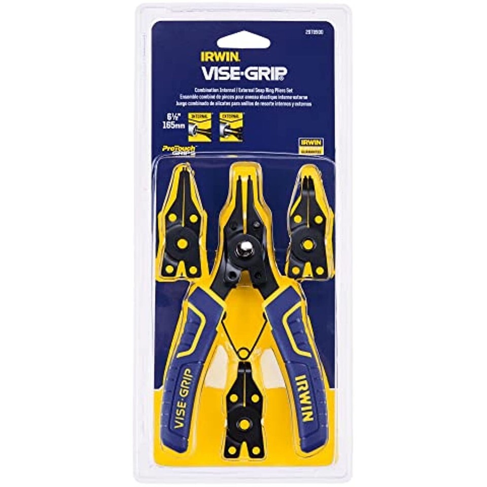 Product Description The IRWIN VISE-GRIP Convertible Snap-Ring Pliers can be used for internal and external use eliminating the need for an extra set of pliers. With four interchangeable tips for ease of moving from one project to the next.. -- The Irwin Vise-Grip 6-1/2-Inch Convertible Snap Ring Pliers combine two tools into one by delivering pliers for internal or external use. The tool includes four interchangeable tips for ease in moving from one project to the next, and a ProTouch grip that provides extra comfort for less hand fatigue. From the Manufacturer IRWIN 6-1/2" Convertible Snap Ring Plier - One pair replaced two for internal or external use, includes four interchangeable tips and features ProTouch grip for comfort and reduced hand fatigue.