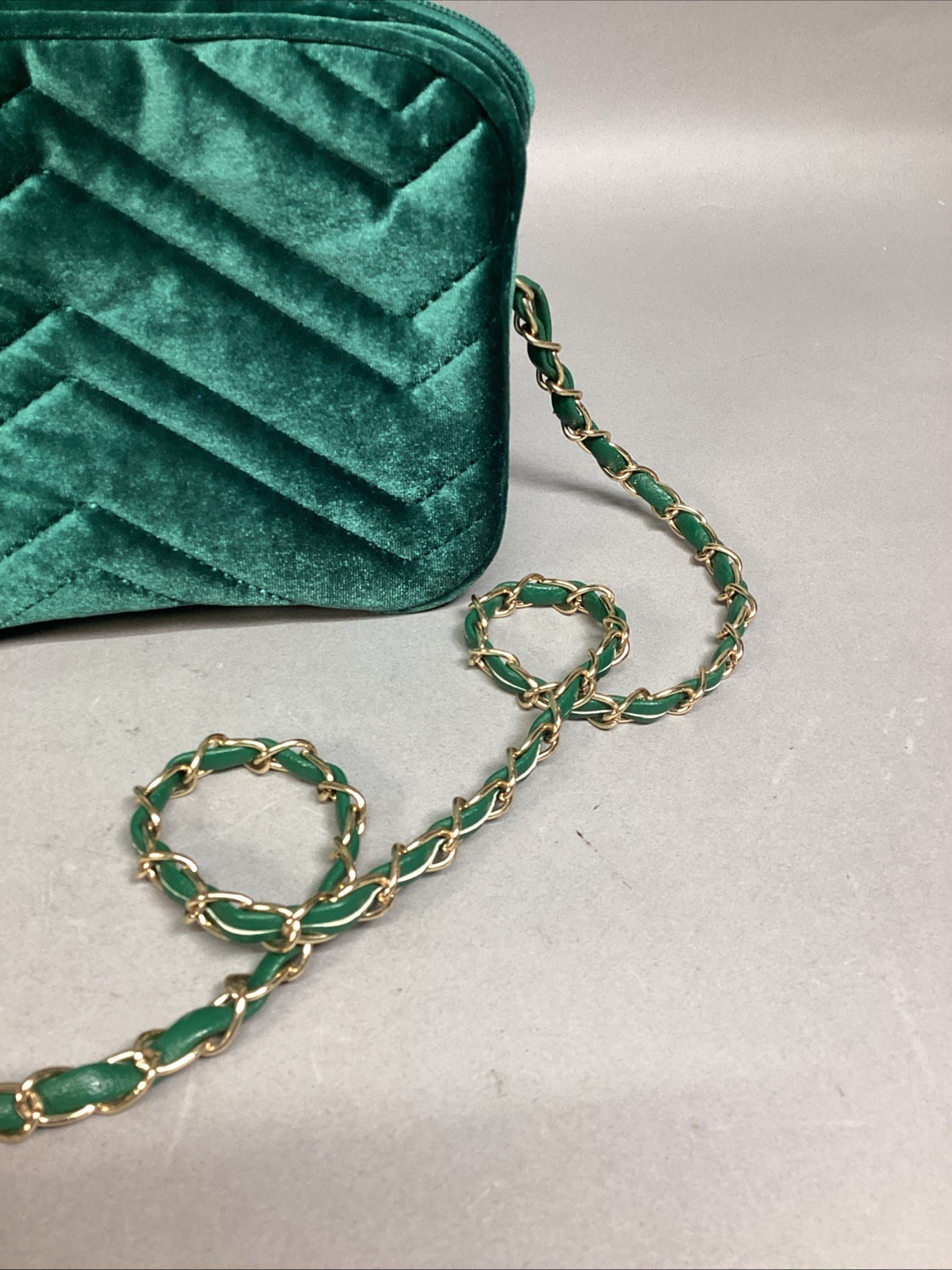 IMOSHION USA Green Velvet Crossbody Bag W/ Chain. In very good condition. Bag measures 8.75x3x6?. The chain isn?t adjustable and measures 22?L