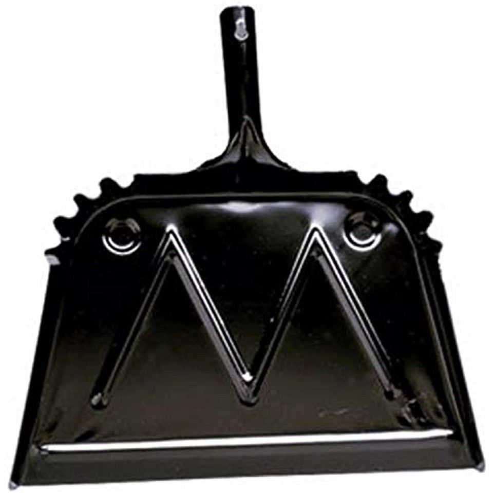 16", Black Metal Dust Pan, Heavy Duty, 1 Piece Construction, Baked-On Enamel Finish, 20 Gauge Steel. Material Black Metal.