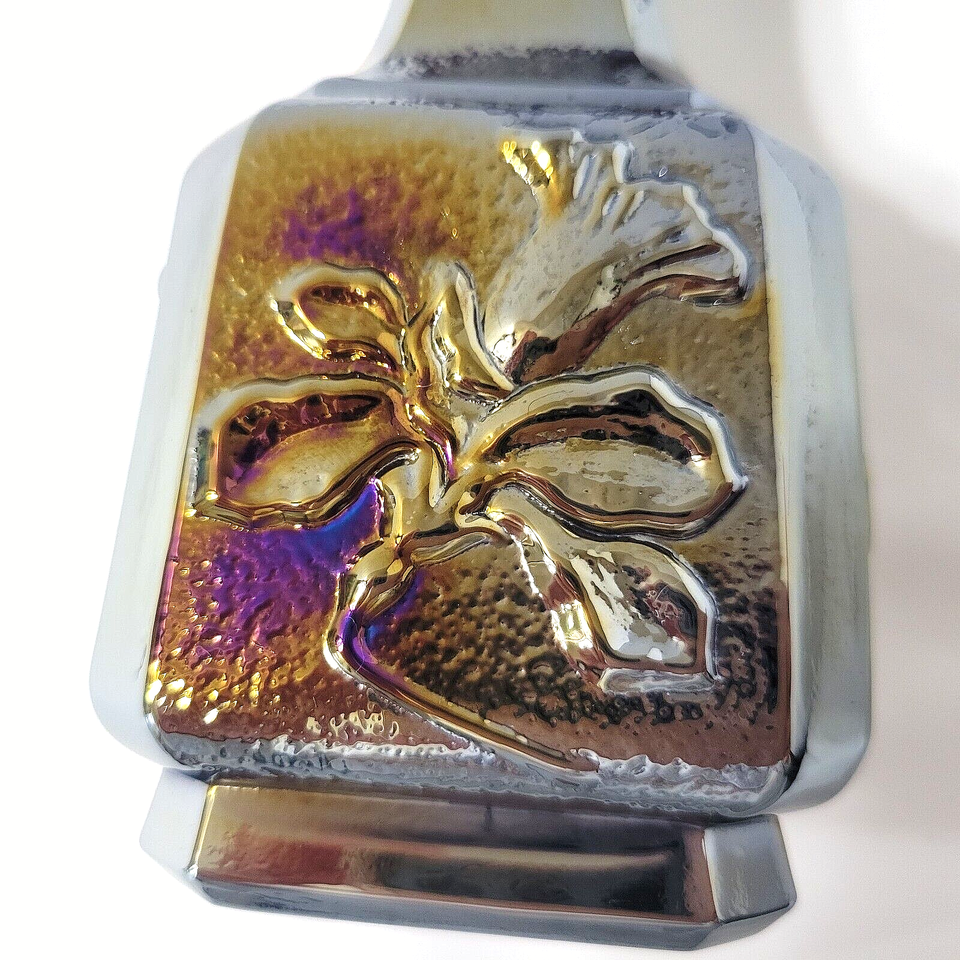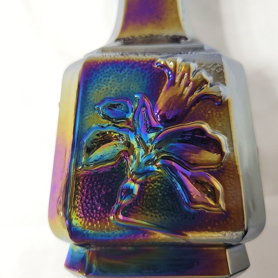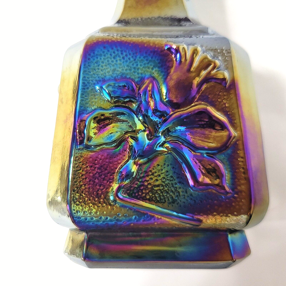 Imperial Glass Carnival Jonquil Vase Amethyst-based in iridescent hues of blue, pink, gold, green All 4 sides feature a 'daffodil' style flower, this has a fluted top rim The coloring on each side is unique to itself Marked with impressed Imperial Glass mark on bottom 6.25" tall, 1.5" wide - coming from smoke free home Shipping is via USPS with Delivery Confirmation, choose Priority or Ground Advantage (slower service) at checkout. Returns accepted provided this same item is returned complete in exact same condition as described and pictured. Refund is for purchase price of item. Buyer pays shipping costs.