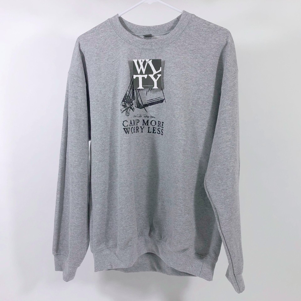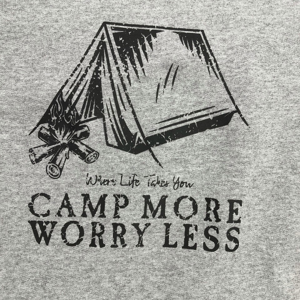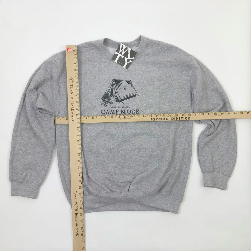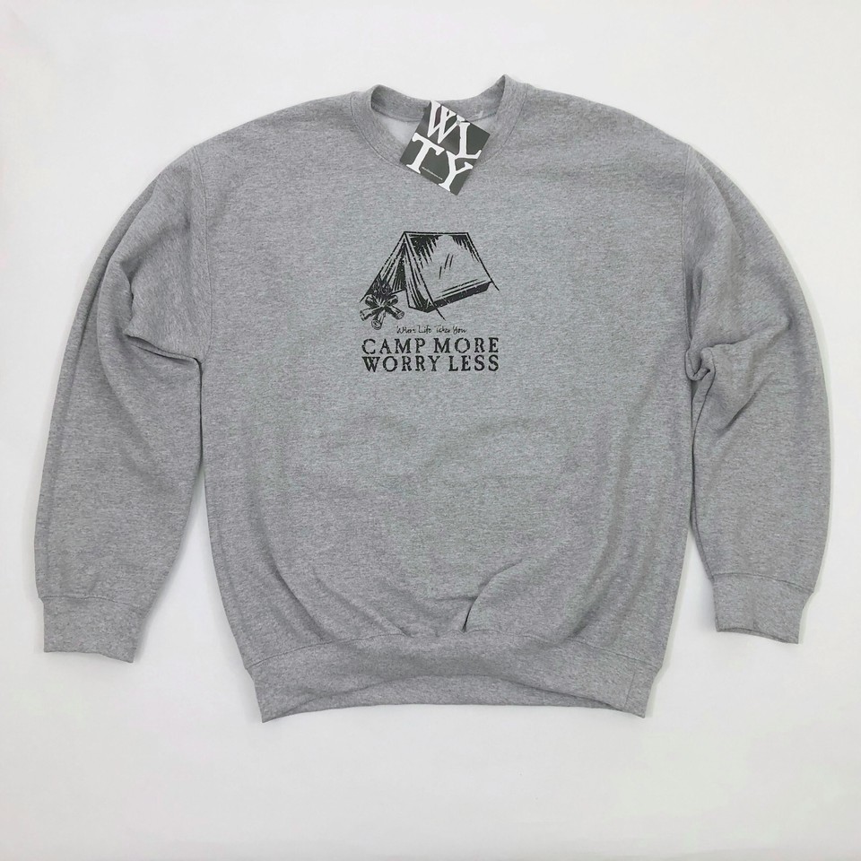 NWT, New With Tags. Unisex "Where Life Takes You Camp More Worry Less" Gildan sport grey sweatshirt. Comfortable sweatshirt has a vintage feel with it's camp fire tent scene in black. Perfect for you or the camper in your life! Please check out the measurements as the size is a unisex medium