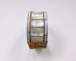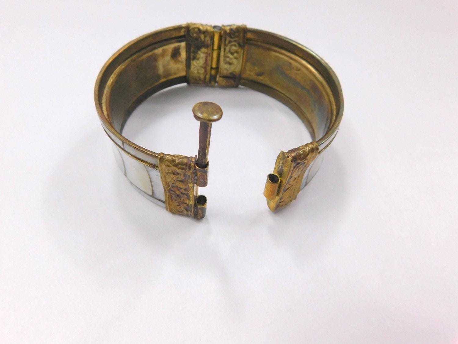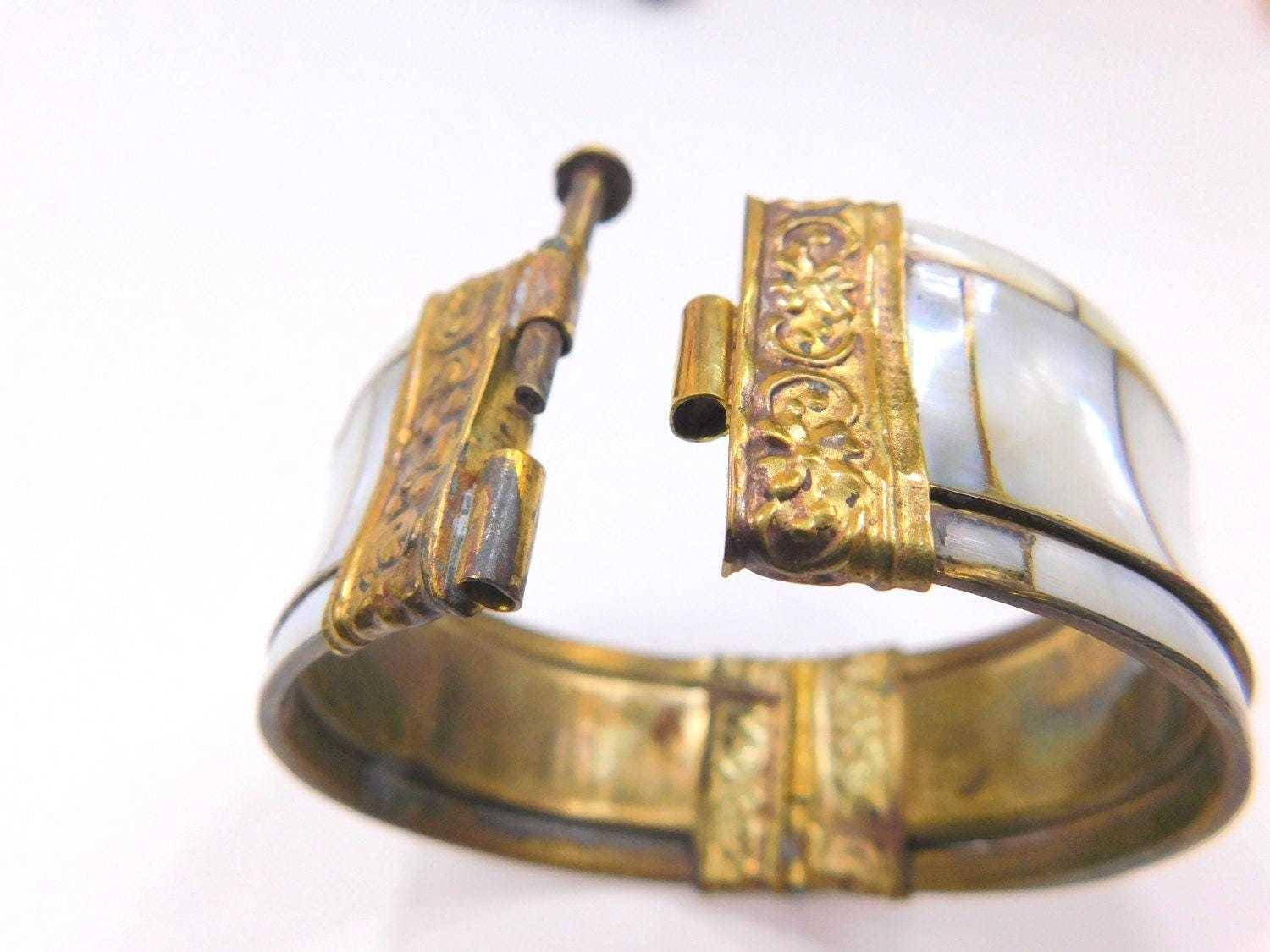 - Indian Brass Bangle, Mother of Pearl Handmade Hinged Cuff