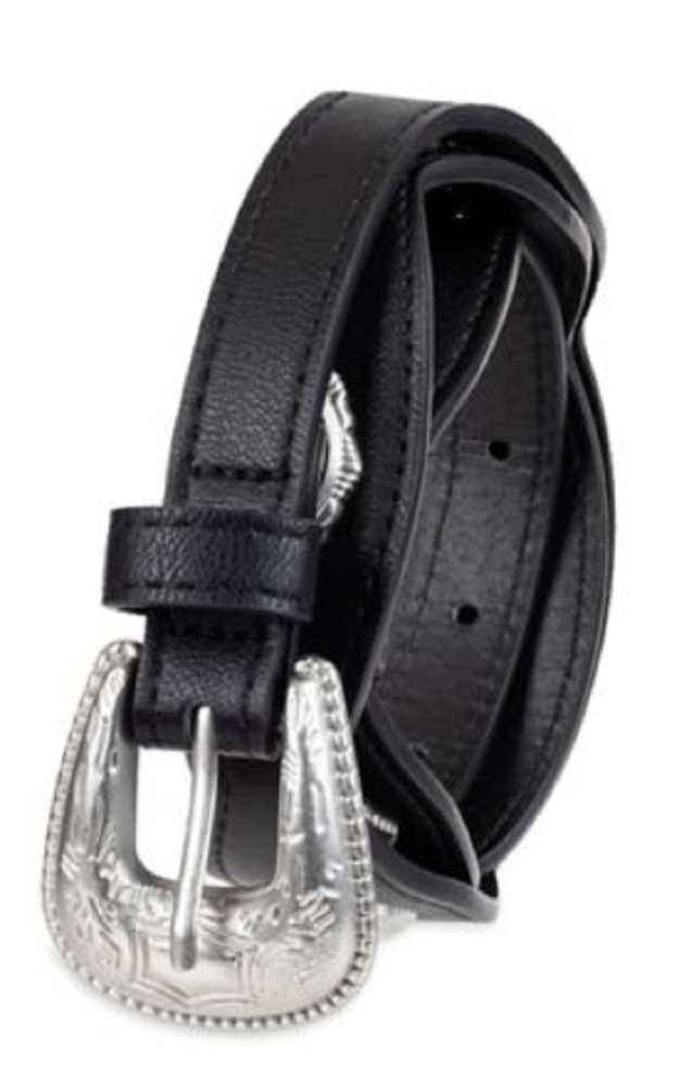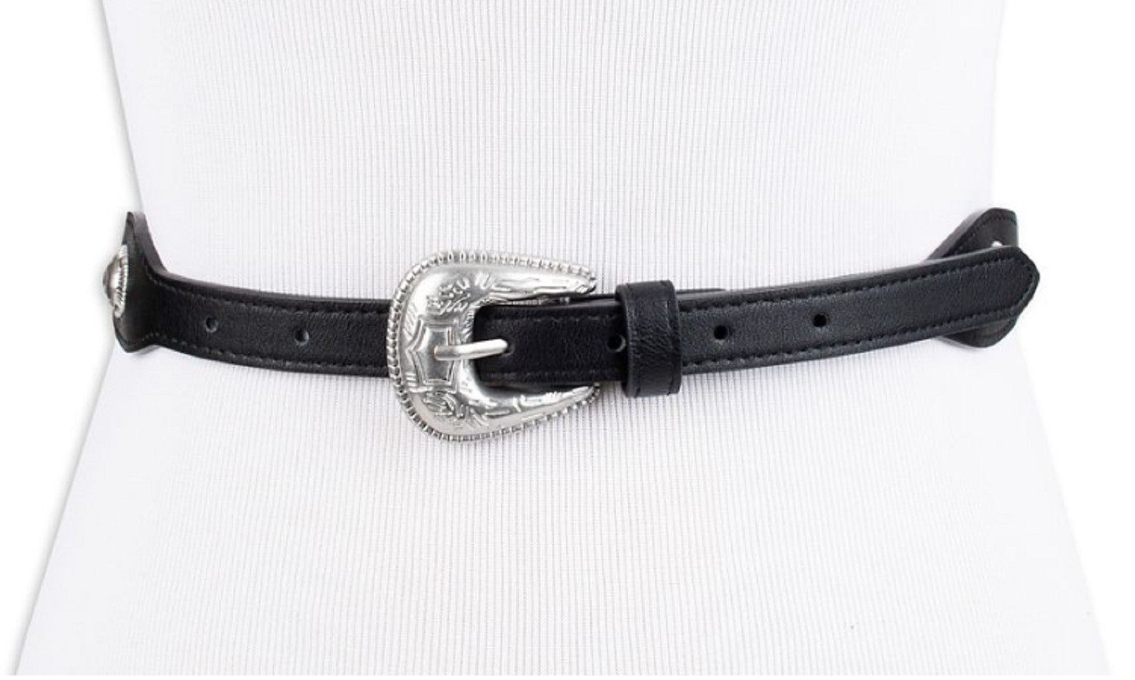 19mm CE western style belt Nickel buckle finish for a unique look Spot clean for best results Women's belt is constructed of durable synthetic leather for long-lasting use Imported leather belt