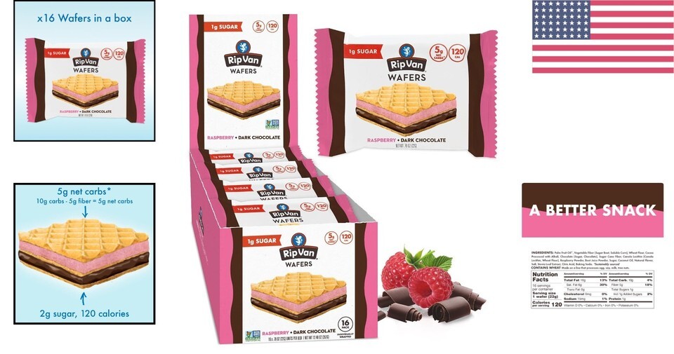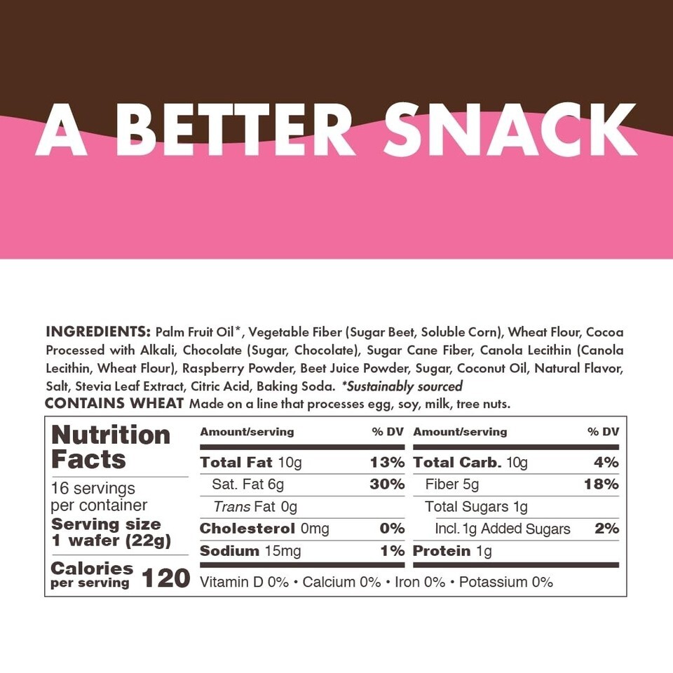 Each box contains 16 individually wrapped Raspberry Dark Chocolate wafers.