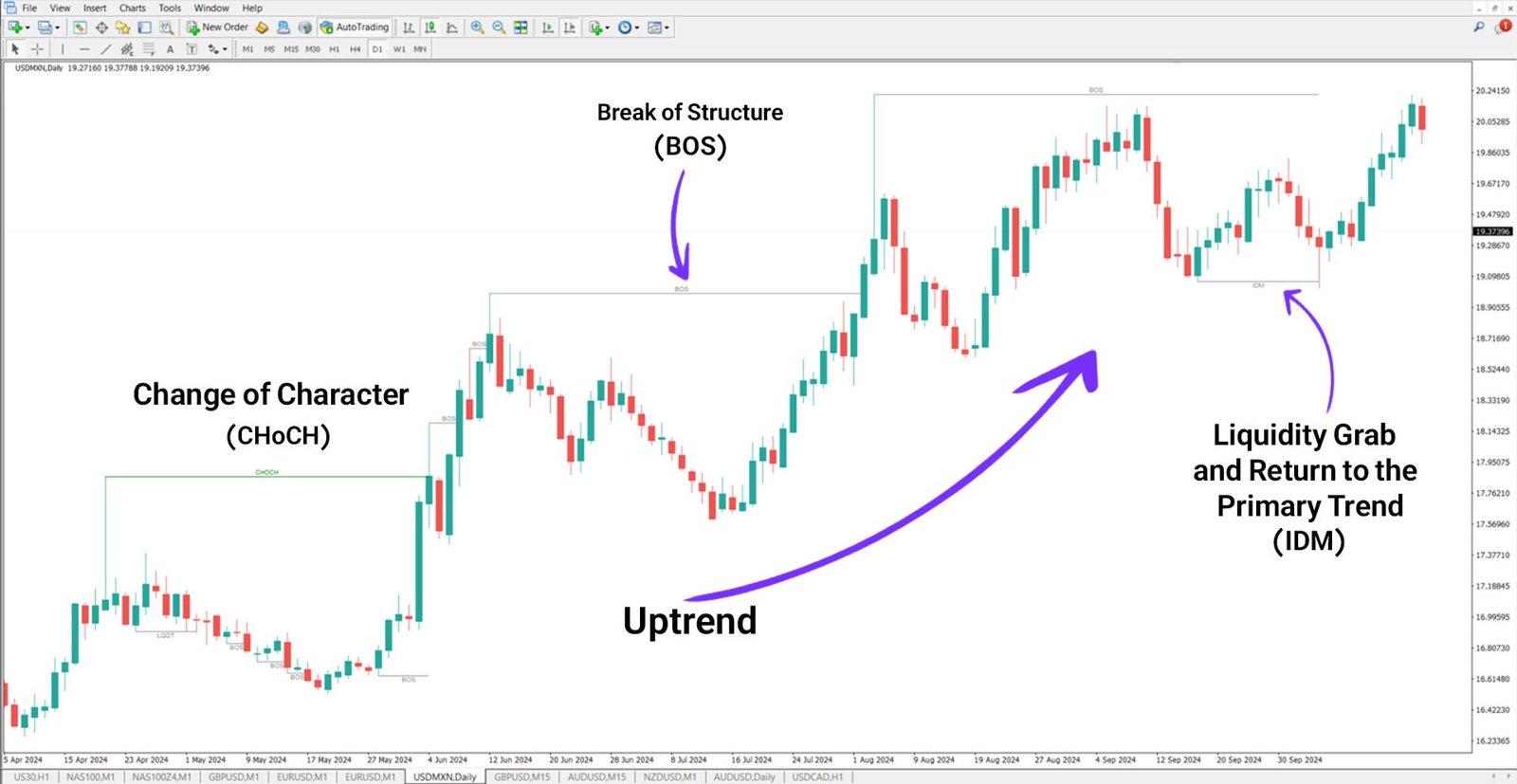 The Market Structure and Liquidity Hunt (MSIS) in MT4 indicator ? is an advanced Smart Money tool built for MetaTrader 4 (MT4). It helps traders decode market behavior by detecting key structural elements such as Change of Character (CHoCH), Break of Structure (BOS), Inducement (IDM), and Liquidity Zones. By combining structure analysis with liquidity mapping, MSIS provides a complete and accurate overview of price action dynamics. ? ? Indicator Specifications ? Categories: ICT MT4 Indicators Smart Money MT4 Indicators Liquidity MT4 Indicators ?? Platform: MetaTrader 4 ? Skill Level: Advanced ?? Indicator Type: Reversal Indicator ?? Timeframe: Multi-Timeframe ? Trading Styles: Day Trading | Scalping ? Markets: Forex | Crypto | Stocks | Forward Market | Share Stocks ? Overview of the MSIS Indicator The Market Structure with Inducements and Sweep (MSIS) indicator is engineered to pinpoint market turning points and institutional liquidity hunts. It automatically marks Inducement (IDM) areas — zones where price manipulates liquidity to trigger retail trader entries — before shifting direction. This tool is especially powerful for ICT and Smart Money traders, allowing them to visualize the story behind each structural change and liquidity grab. ? ? Example – Uptrend Structure On the USD/MXN daily chart, an uptrend starts after a Change of Character (CHoCH). The MSIS indicator automatically identifies every Break of Structure (BOS) and highlights liquidity areas where potential pullbacks or re-entries can occur. ? Highlights: CHoCH marks the shift from bearish to bullish sentiment. BOS confirms structural continuation. Liquidity zones display institutional footprints. ? Example – Downtrend Structure On the USD/CAD 1-hour chart, a bearish movement begins following a Break and Change of Character (CHoCH). As the trend progresses, each BOS is marked and inducement levels are automatically outlined to reveal possible liquidity sweeps before continuation. ? Highlights: CHoCH and BOS confirm downtrend initiation. Liquidity traps identified along key lows. Inducement levels mapped for precision entries. ?? Indicator Settings ? Chart Object Color: Customize theme and appearance. ?? Candles to Check: Number of candles analyzed for structure. ? Swing CHoCH: Defines how Change of Character is calculated. ? Swing BOS: Configures Break of Structure detection. ? Swing Inducement: Determines inducement recognition method. ? Conclusion The MSIS Indicator transforms price charts into a roadmap of market intent and liquidity flow. By combining CHoCH, BOS, IDM, and Liquidity Zone identification, traders can see how smart money manipulates price — and position themselves accordingly. Perfect for ICT and Smart Money style traders, this tool enhances precision, structure clarity, and trade confidence. ?