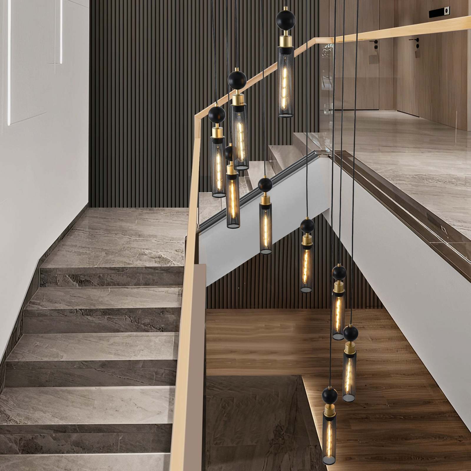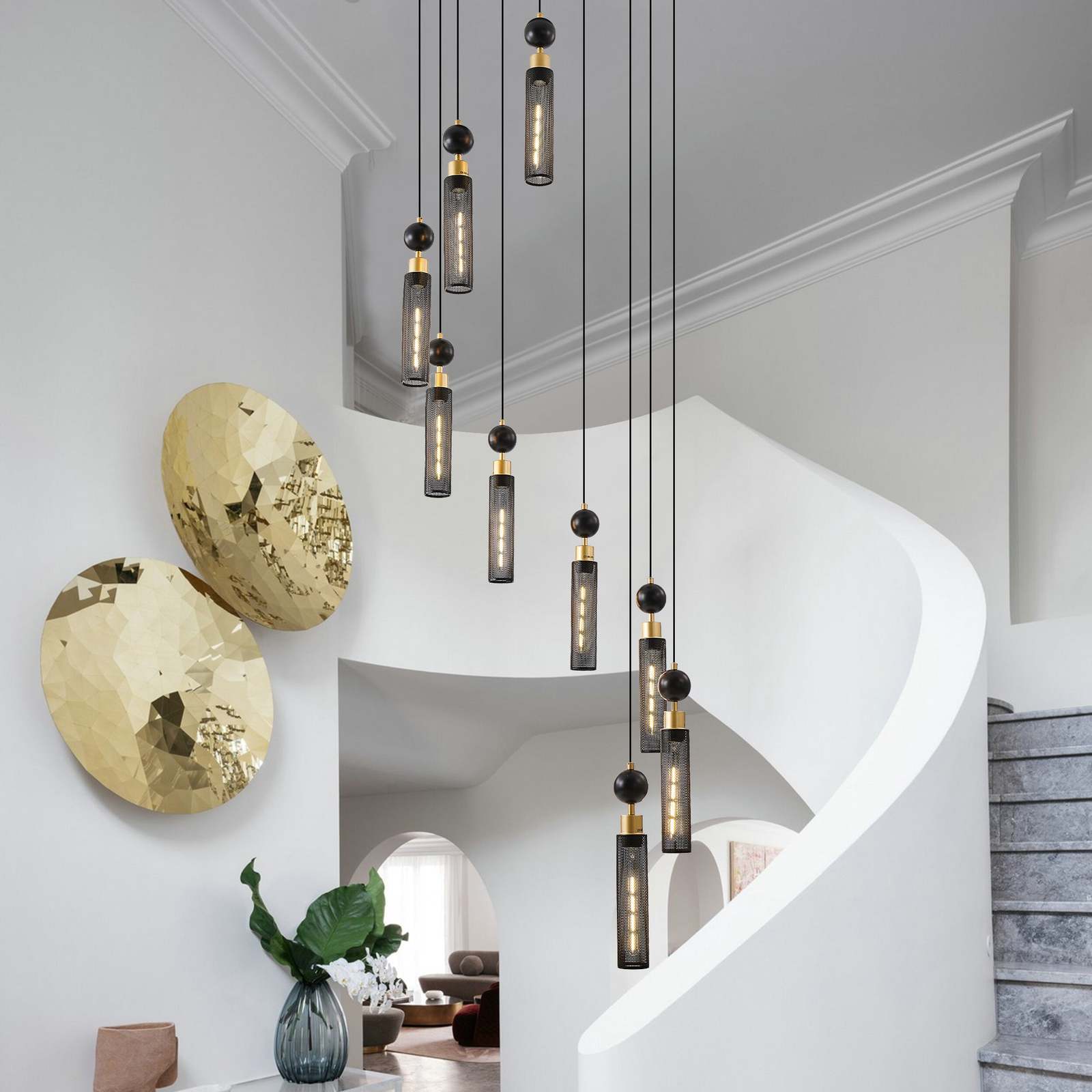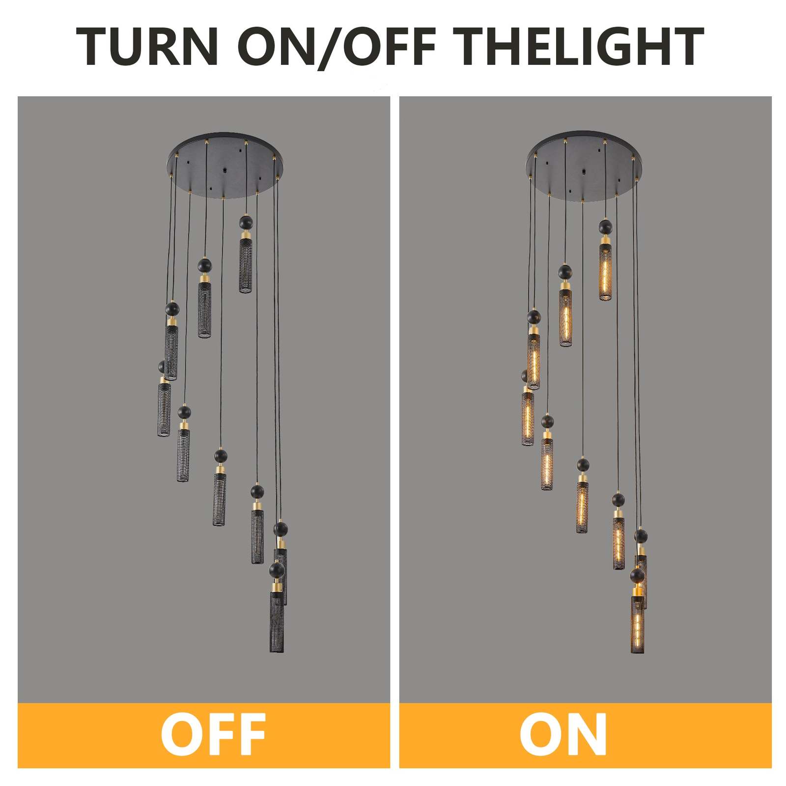 Multi head pendant light with strong layering:Nine head pendant lamp design, with adjustable lamp height, creates a rich sense of spatial hierarchy, especially suitable for tall staircases or large spaces.