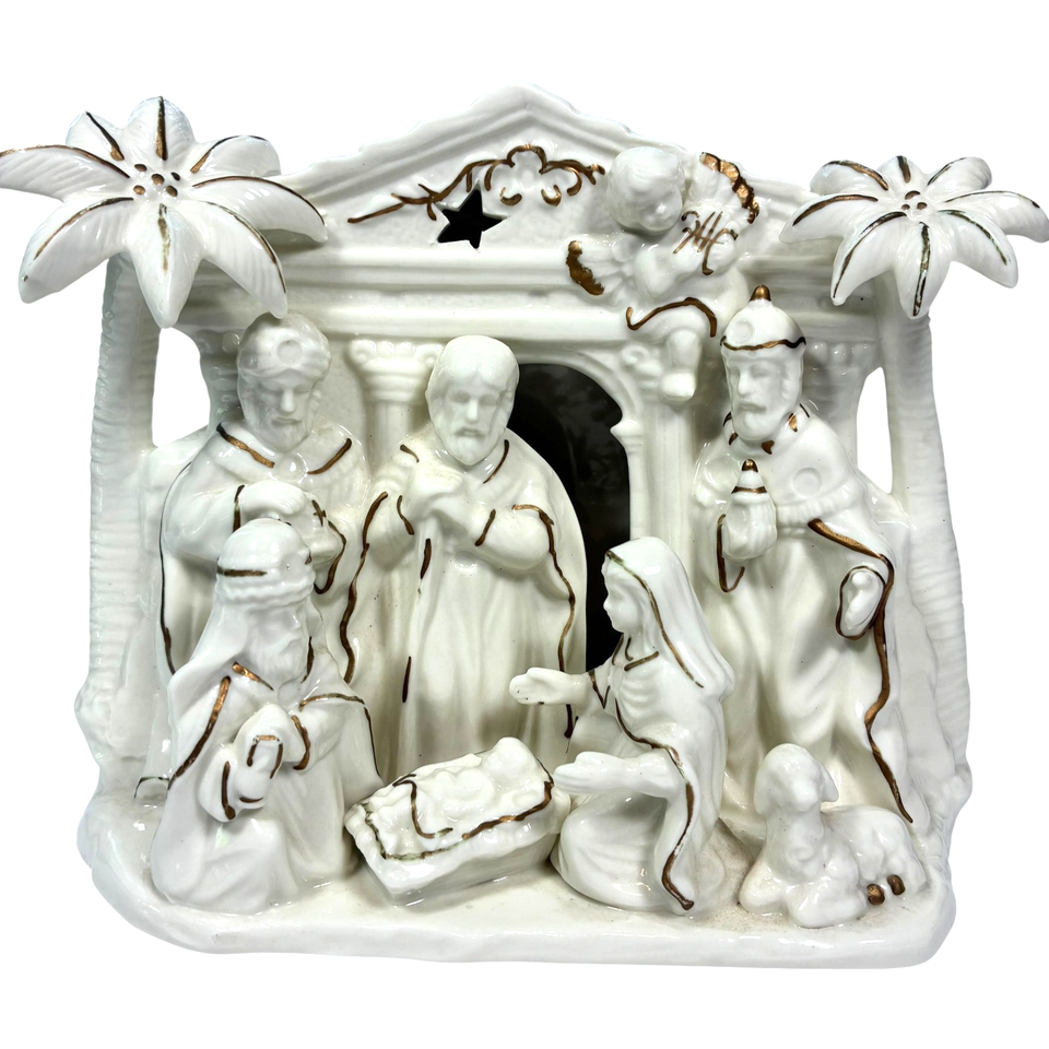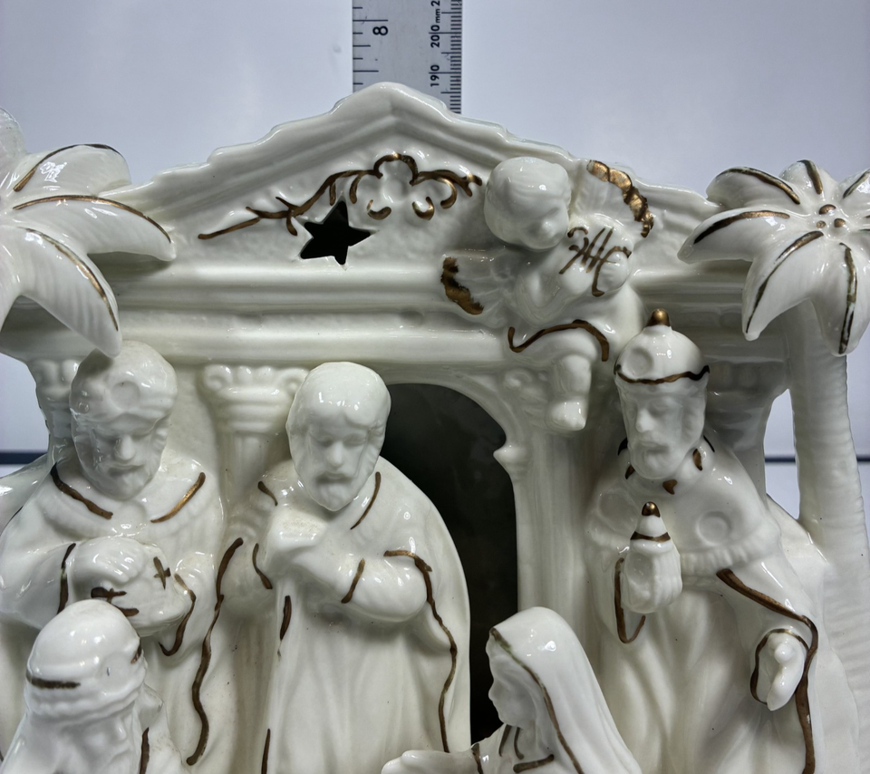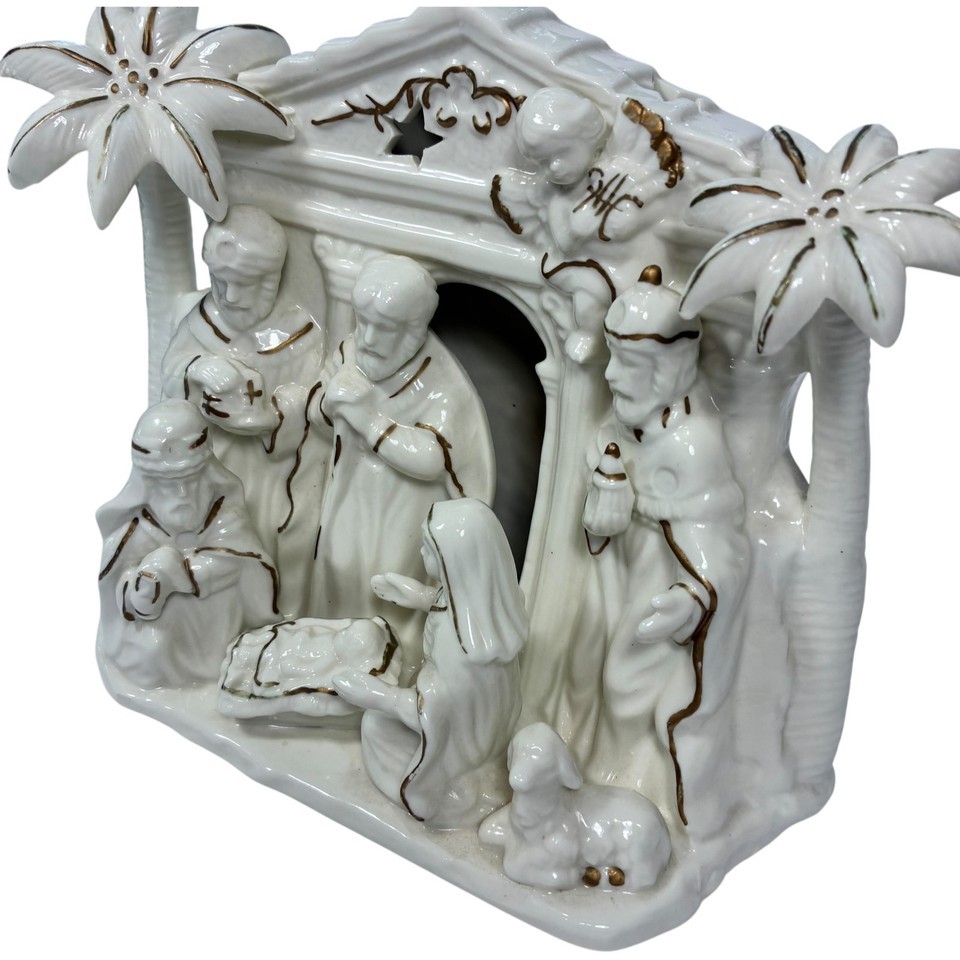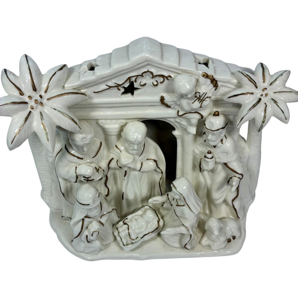 International Bazaar Ceramic Nativity Ivory Colored And Trimmed In Gold - EUC Can be lit up by small candle or clip light (bottom is prepared for that) Buy with confidence. Check out our reviews.