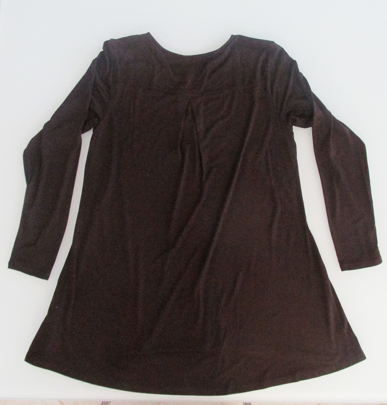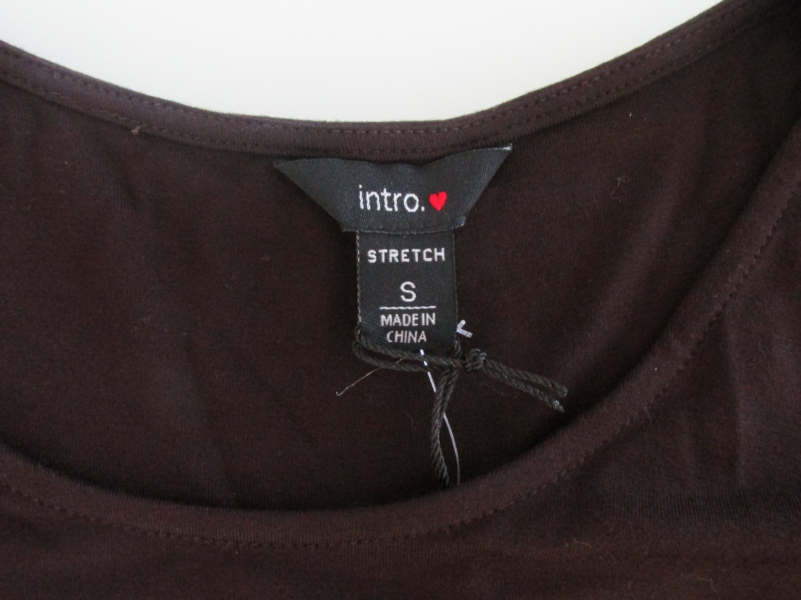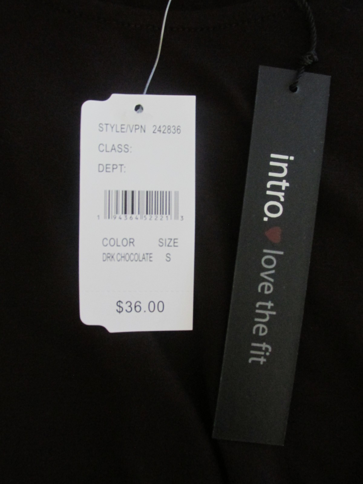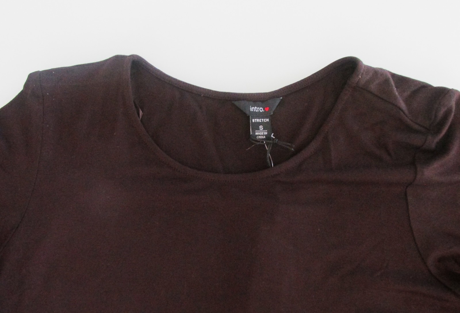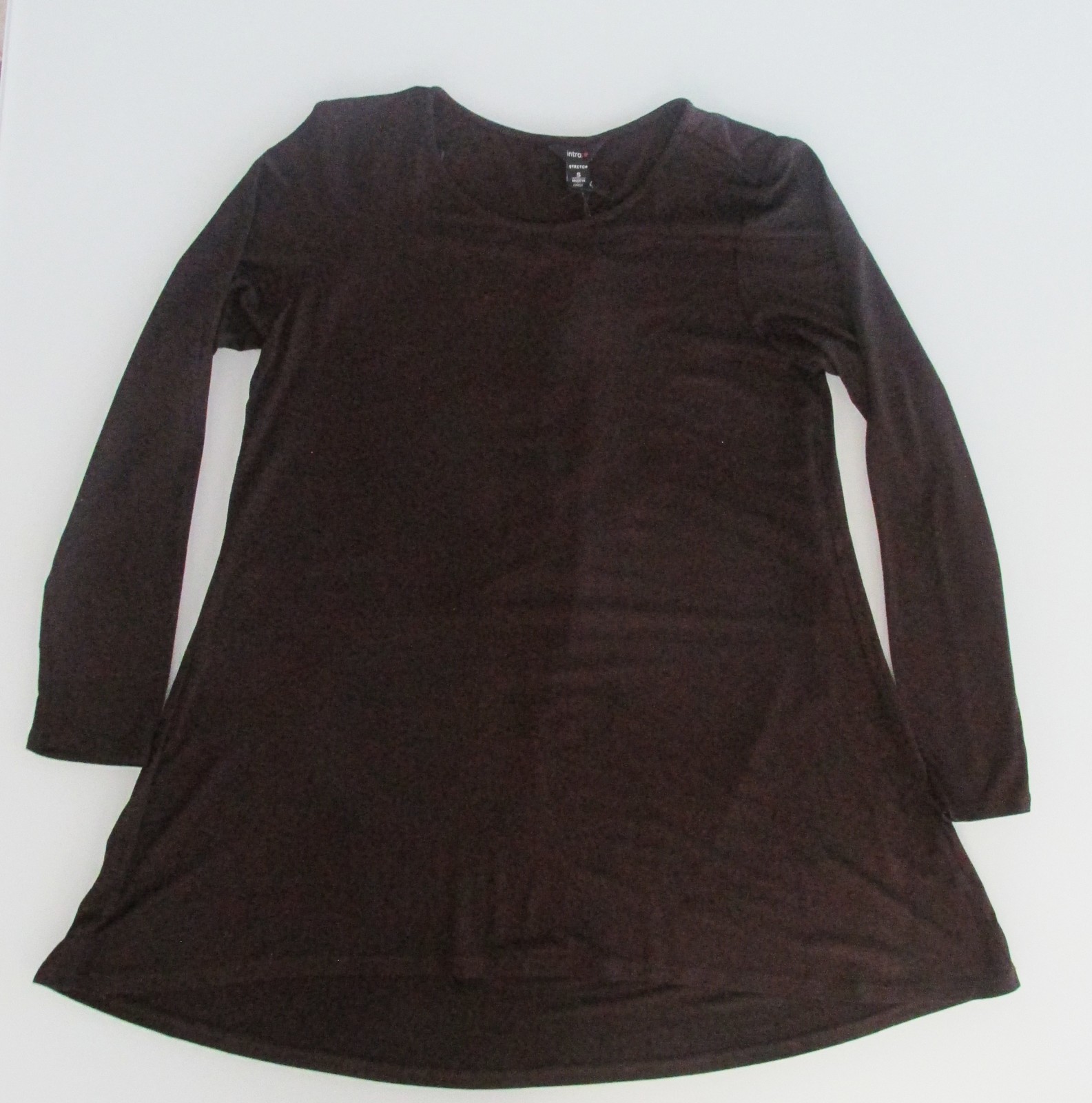 Description: Up for sale is an Intro (NWT) women's long sleeve lightweight stretch knit top. It is size small. The top is dark brown in color. It is made of 95%rayon/5%spandex stretch knit fabric. This top shirt is a pullover style with a round neck neckline, pleated back and flared bottom. The back is 3" longer. This Intro (NWT) pullover knit top has the original $36.00 price ticket attached.