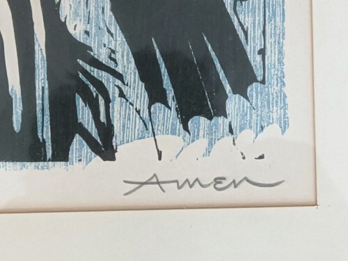 Up for sale is a framed limited edition Woodcut Print by Irving Amen titled "The Prayer" and numbered 97/200.