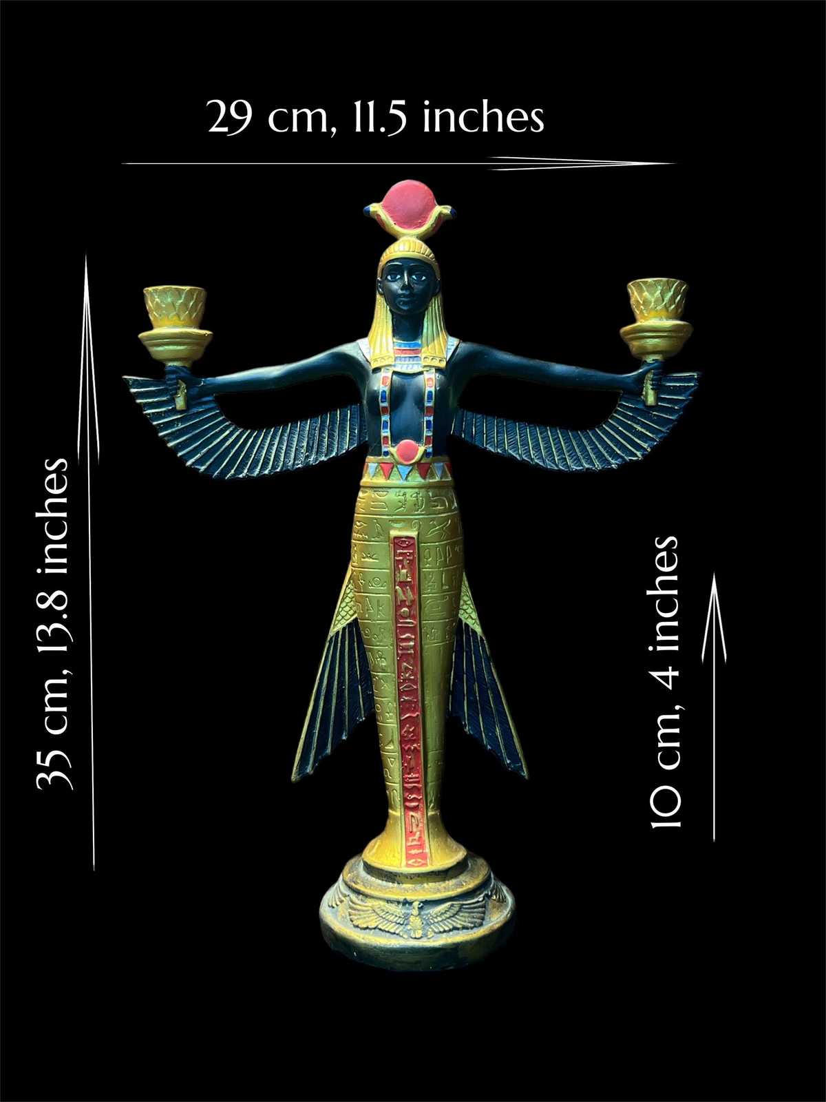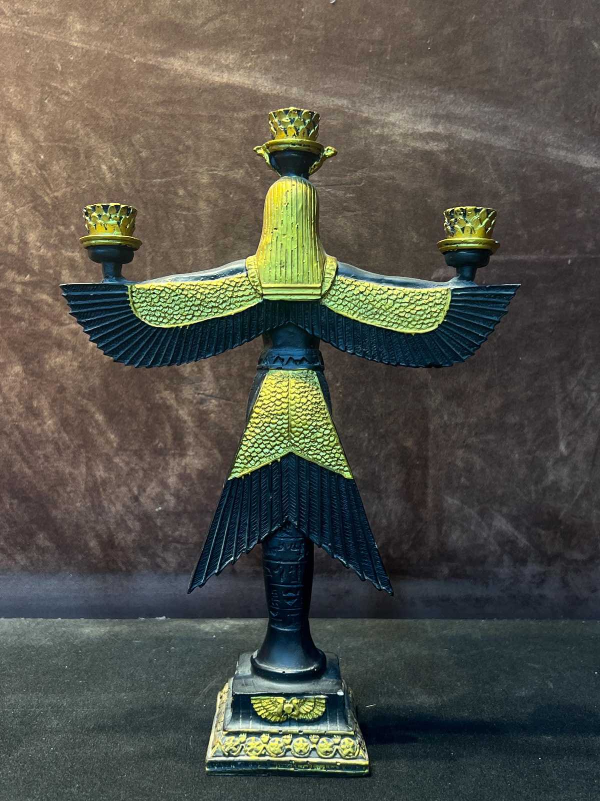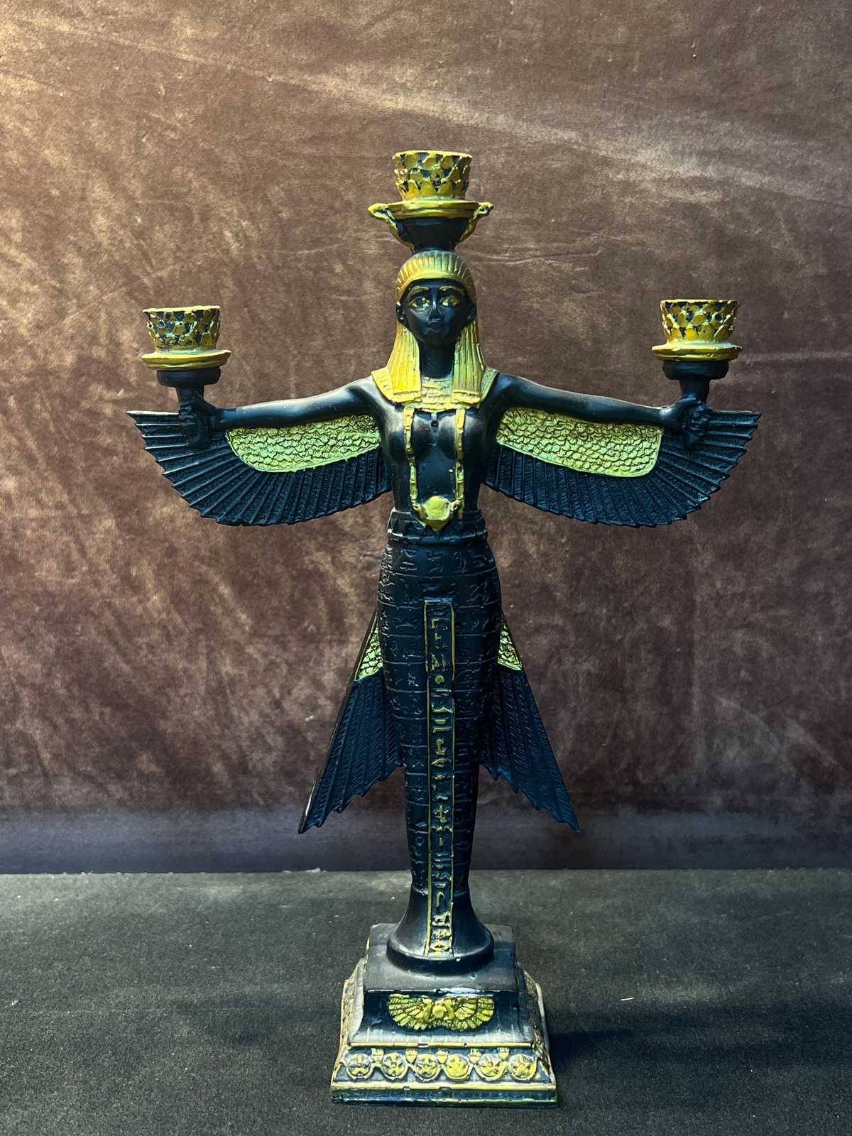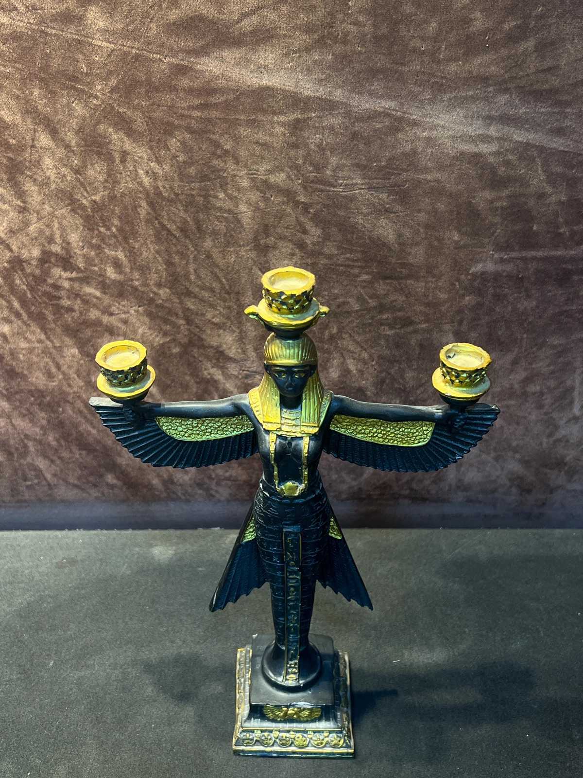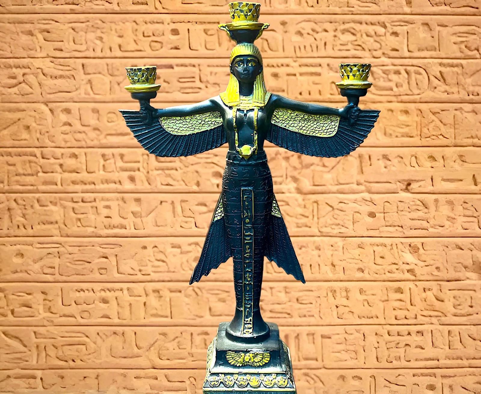 - **Intricate Craftsmanship:** Each candle holder is meticulously handcrafted and carved, showcasing elaborate details of Isis with her majestic open wings. The statue exudes an aura of elegance and spirituality, making it a stunning focal point in any room.