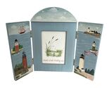 A charming **Island Creek Trading Co.** coastal-style picture frame featuring a hand-painted lighthouse motif on a soft blue background. The hinged triptych design opens to reveal multiple lighthouses, a sailboat, and scenic seaside views, creating a perfect nautical display for your favorite 3x5 photo. Made of solid wood with brass hinges and back clasps. Ideal for beach house decor or maritime collections.