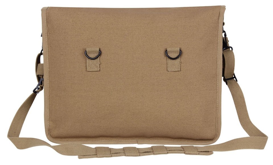 Carry all your essential gear and supplies while on the go with Rothco’s Canvas Paratrooper Bag. Measuring 15 inch x 11 inch x 4 inch, this versatile bag is large enough to fit most laptops, and other supplies, making it ideal for daily use, work, or travel. The bag features a 3-divider section that keeps all your gear organized and easily accessible. A large flap closure with a metal clip ensures your contents remain secure during transit. Constructed from heavyweight unwashed cotton canvas, this messenger bag is designed for durability and longevity. An outer snap compartment features two rows of nine shell loops, providing storage for writing utensils or other small items. The adjustable shoulder strap extends to 41 inches, allowing you to carry the bag comfortably over your shoulder. The front of the bag proudly displays a red parawing symbol, adding a touch of distinctive style to this practical accessory. Made from Rothco’s durable heavyweight canvas fabric, this superior material is naturally water-resistant, rugged, and is built for the long haul. No one comes close to Rothco’s collection of ultra-premium canvas bags and packs.