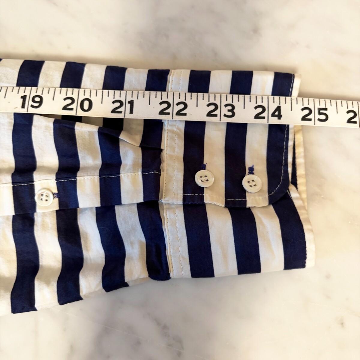 J Crew navy blue and white striped blouse, women's size 12. Lightweight boy cut cotton shirt has button front with chest pocket. Long sleeves with two-button cuffs and placket button. Excellent condition. Measurements are taken across flat, unstretched garment: Shoulders (seam-to-seam across the back): 16-1/4" Chest (underarm to underarm): 21" Sleeves (shoulder seam to cuff): 24-1/2 Overall Length (from nape of neck): 28"