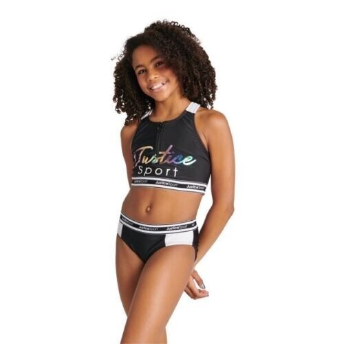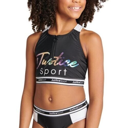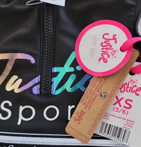This Sale is for One (1) Justice Sport? Swimsuit Girls' Size Extra Small (5/6) Two (2) Piece Longline Zip Bikini Multicolored Half-zip pull front Logo trim elastic Ombre logo rubber print Lined 84% Recycled Polyester 16% Spandex UPF 50+ provides excellent UV protection complies with AATCC 183/ASTM D6603 Swimsuit is new with tags Please view photos for a good description of this item Thank you!