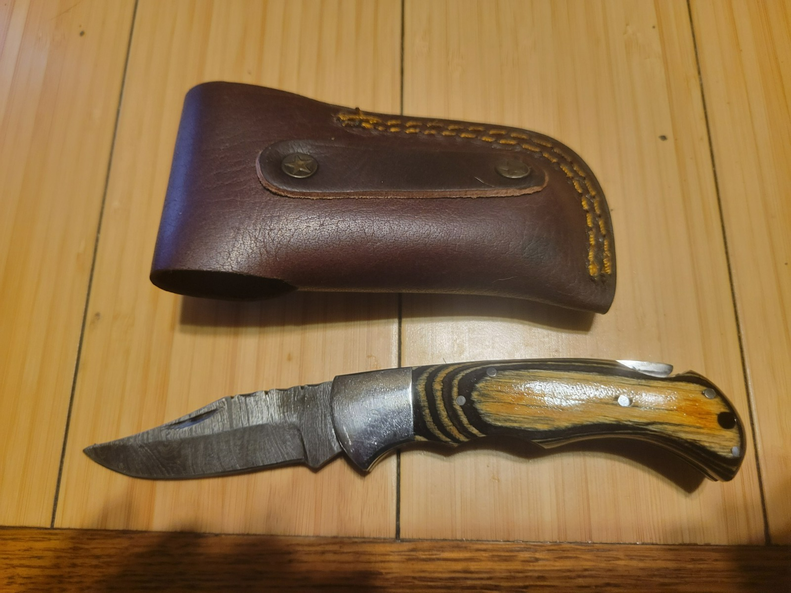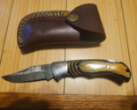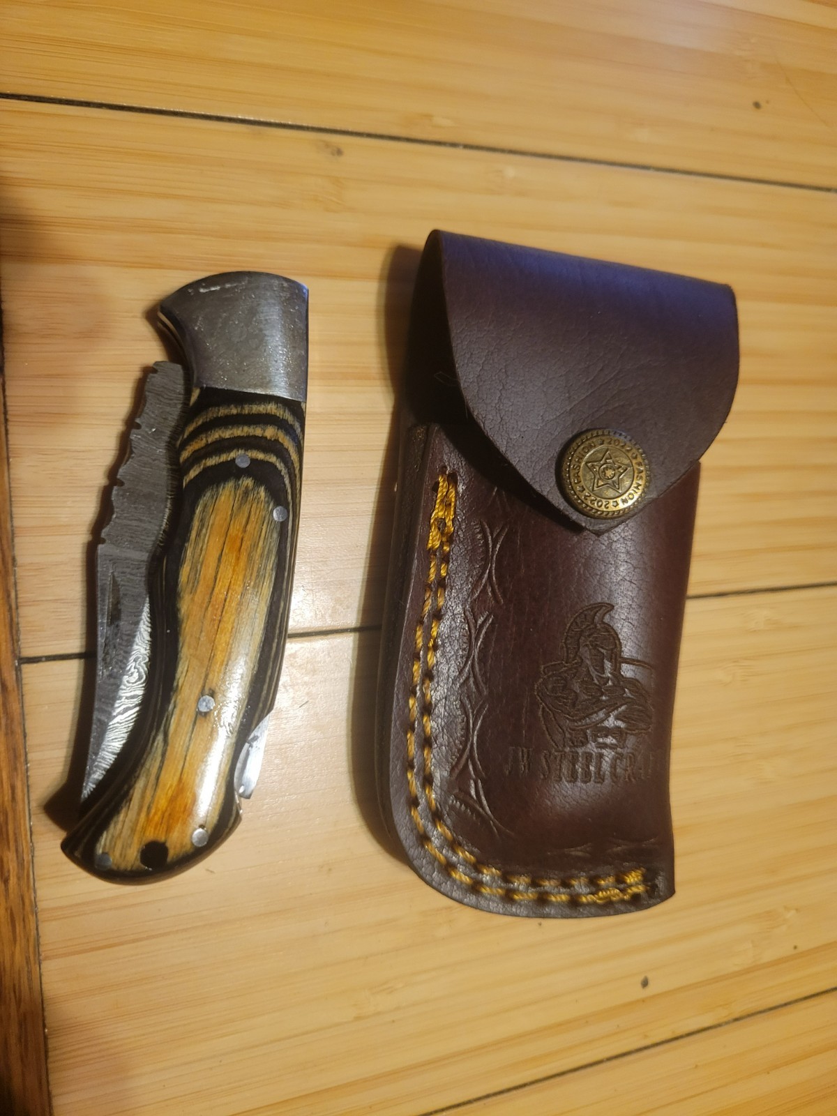 - JW Steel Crafts Damascus Pocket Knife Tan Wood & Dark Wood Handle