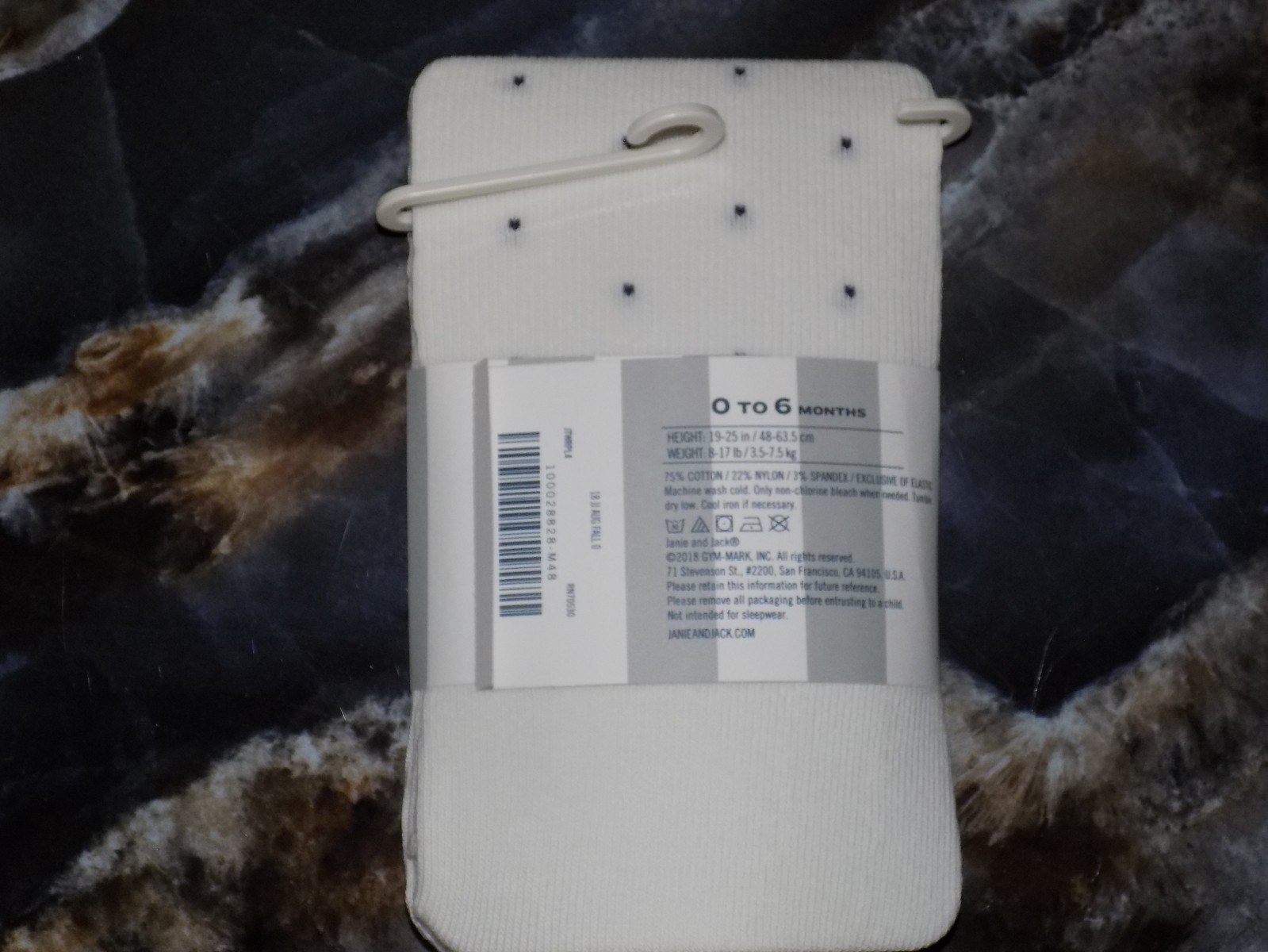 The product is a pair of Janie and Jack white tights with black dots, designed for baby girls aged 0-6 months. Made of 75% cotton, 22% nylon, and 3% spandex, these crawling tights are both stylish and comfortable for little ones. The classic white color with playful black dots adds a cute touch to any outfit, making them a versatile and adorable addition to a baby girl's wardrobe.