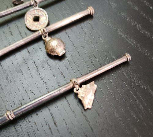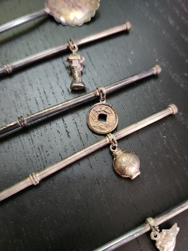 (6 Pc) A japanese Sterling Silver iced tea sipper spoons set, designed with a bamboo shaped straw and engraved floral bowls and decorative charms attached with pendants depicting a fish, a bowl, a house, a perfume bottle, a fan and a temple. Marked "Sterling Japan".