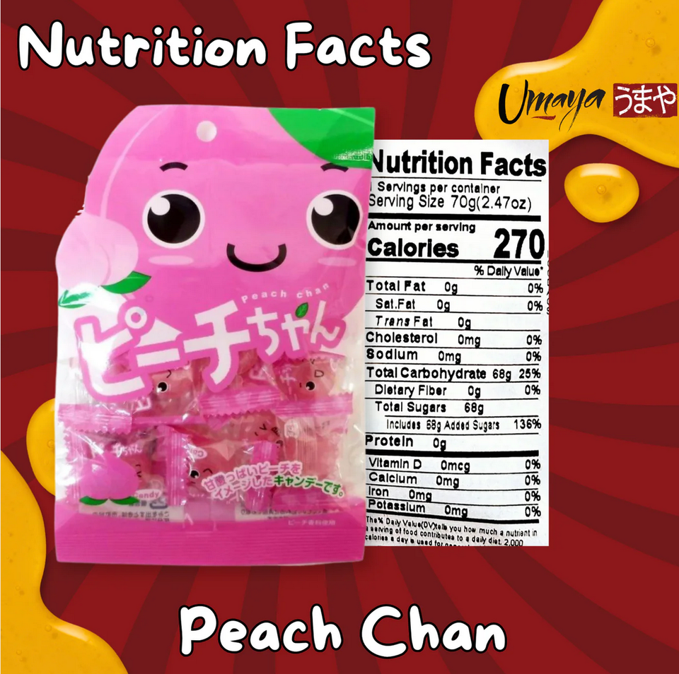 Indulge in the sweet and tangy flavor of delicious Kawaguchi peach chan hard candies! Each candy is juicy and bursting with flavor, and their unique ridged texture adds to the fun of enjoying them. The packaging is eye-catching, featuring adorable illustrations of peaches with cute faces. Each piece is individually wrapped, and there are approximately 12 pieces per pack, making them a perfect choice for candy jars, snack packs, school lunches, and more.