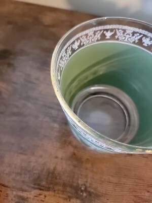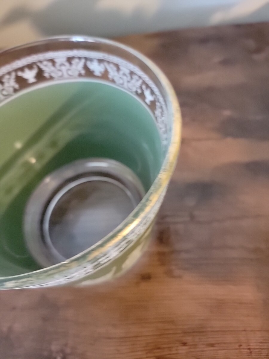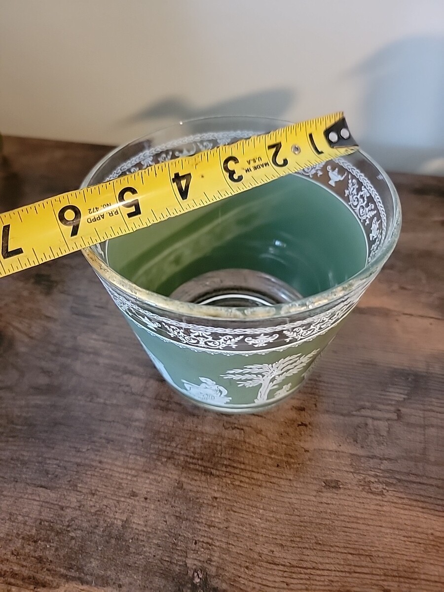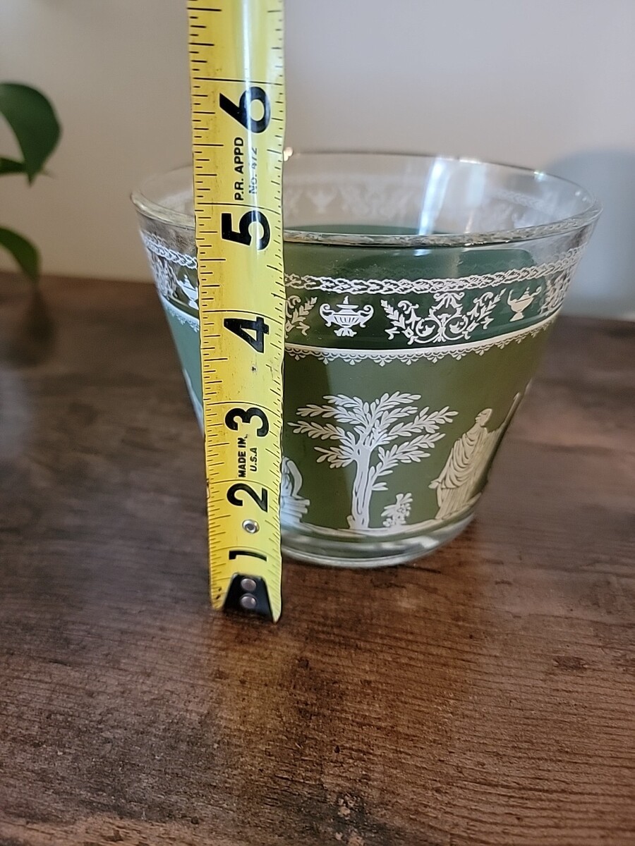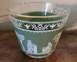 The Jeanette Glass Co. Hellenic Jasperware Wedgwood style ice bucket is a vintage collectible from the 1960s, featuring a classic green color and a normal glass material. This original ice bucket exudes a sense of nostalgia with its retro style and is perfect for any kitchen or barware collection. The brand's reputation for quality glassware is evident in this unique and charming piece that adds a touch of elegance to any home.
