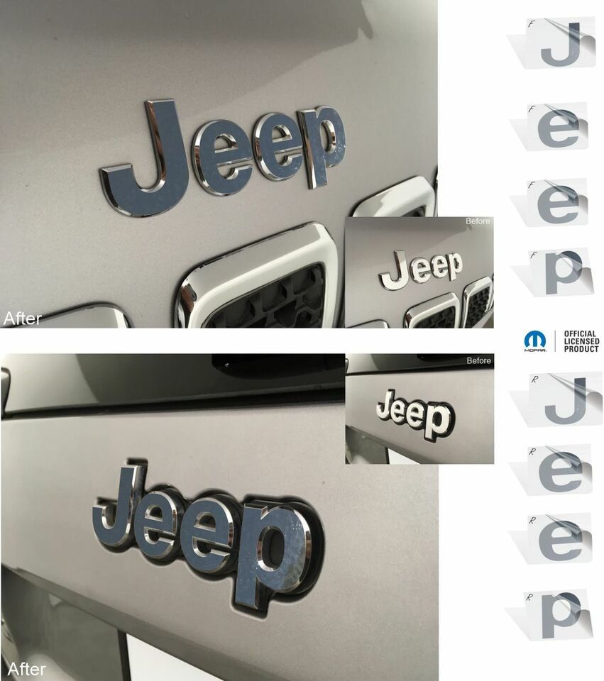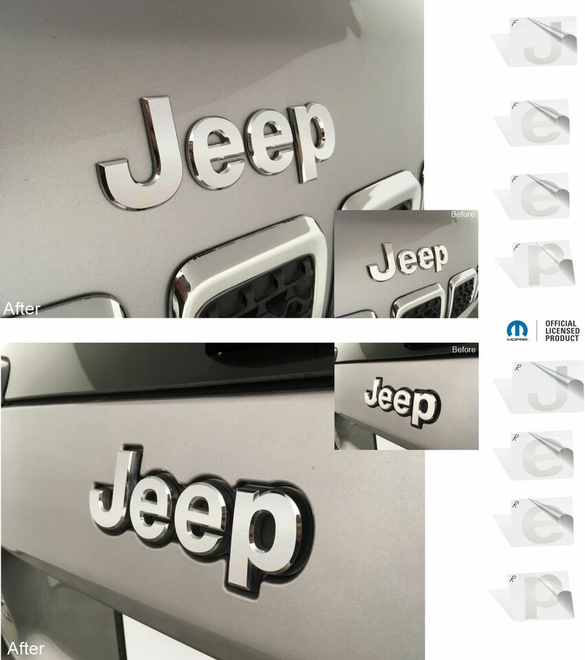 Decals (stickers) designed to be applied onto the top/front of the JEEP emblems on the hood and lift gate.
