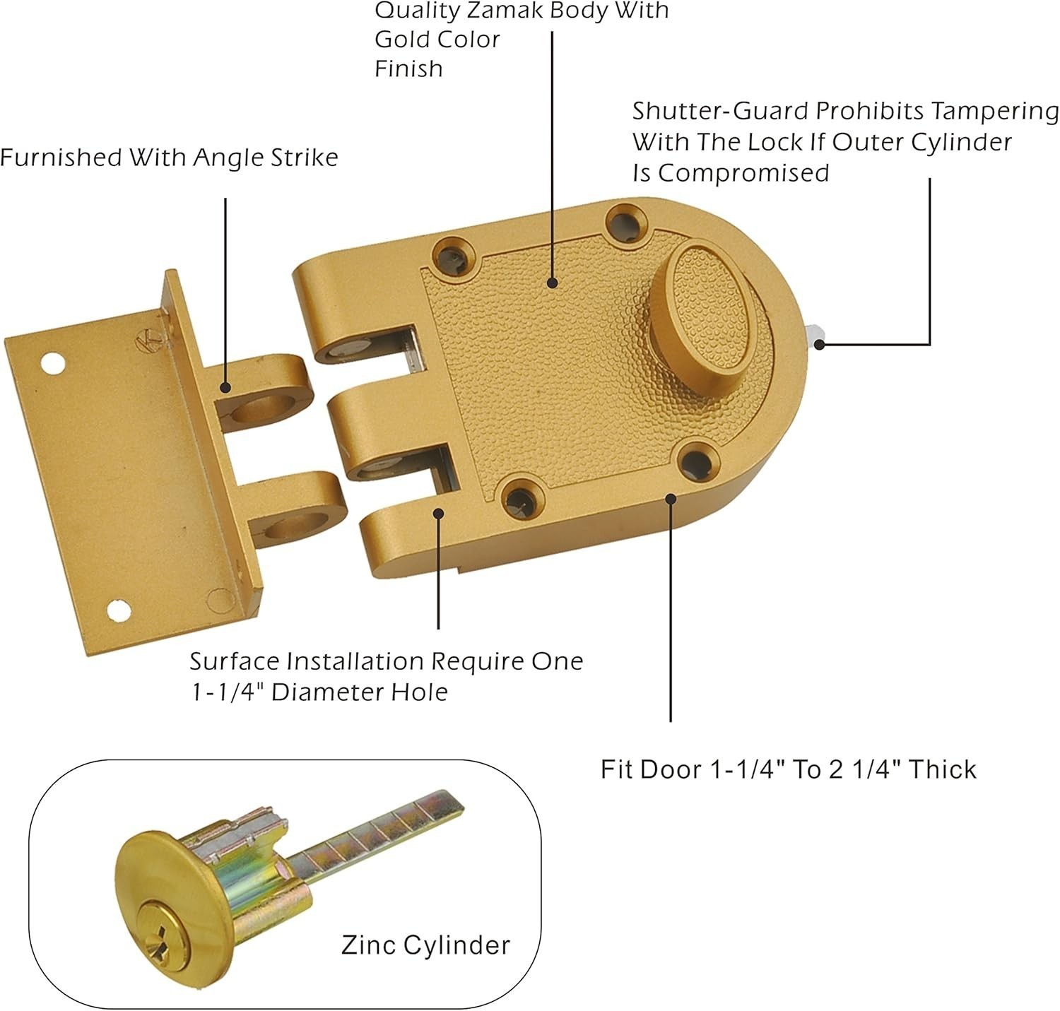 Elevate your security with our deadbolt lock, crafted from durable diecast for long-lasting strength. Featuring a Shutter-Guard to prevent tampering, this single-cylinder rim lock comes with a zinc cylinder and a pair of KW1 keys in a sleek silver finish. Designed to fit door thicknesses from 1 1/4" (32mm) to 2 1/4" (57mm), it?s an ideal replacement for new or existing doors. The surface-mounted installation requires a 1 1/4" (32mm) diameter hole for the keyed deadbolt and includes an angle strike that securely bolts the door to the jamb with two interlocking bolts. Enhance your home or office security with ease and confidence.