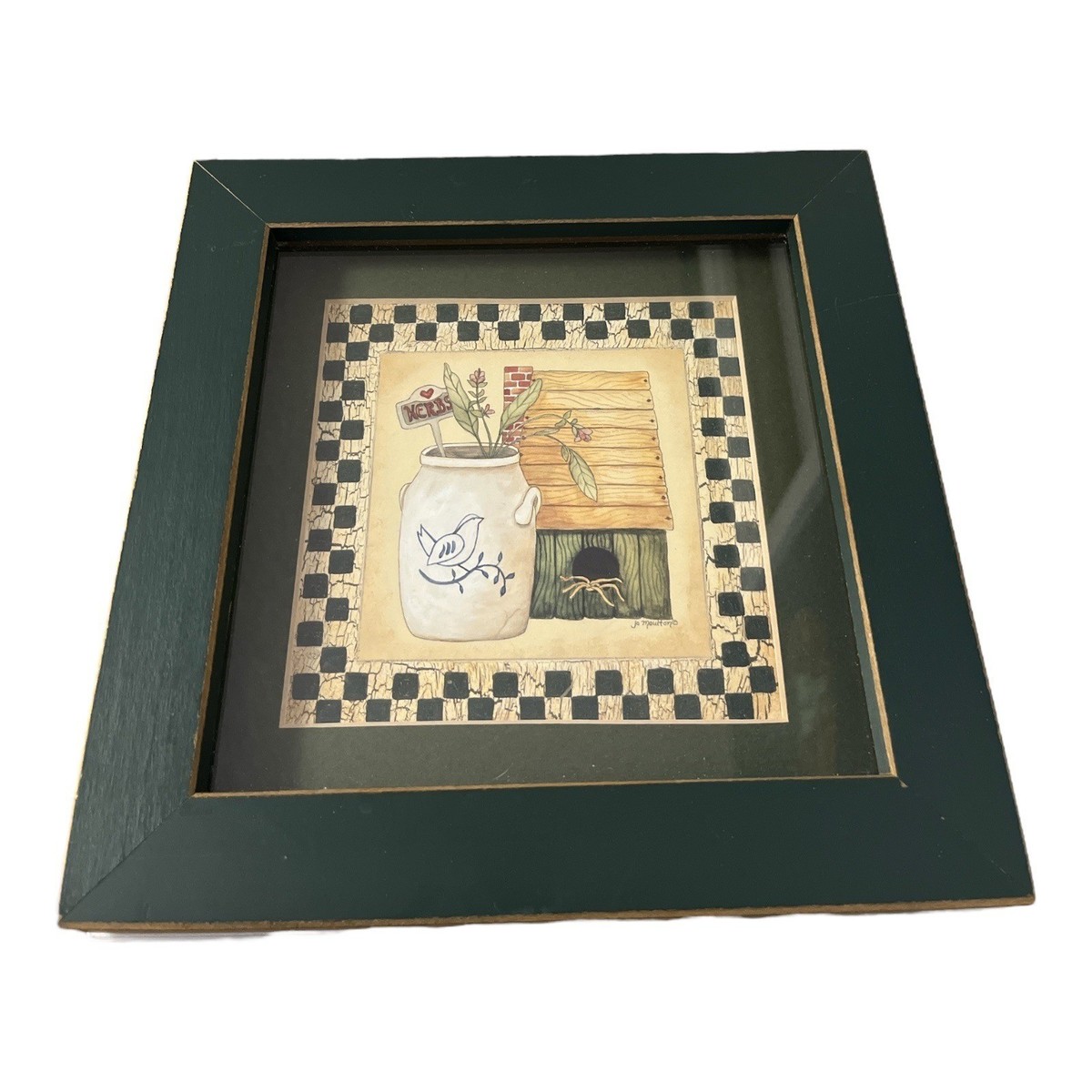 A charming small framed wall art piece titled *?Birdhouse Kitchen?* by artist **Jo Moulton**, part of a 1999 series distributed by Dayton Hudson Corporation (parent company of Target). The artwork features a rustic country kitchen motif with a crock, flowers, and checkered border, rendered in Moulton?s signature folk art style. The print is protected under glass in a deep green wooden frame with light gold distressing along the edges.
