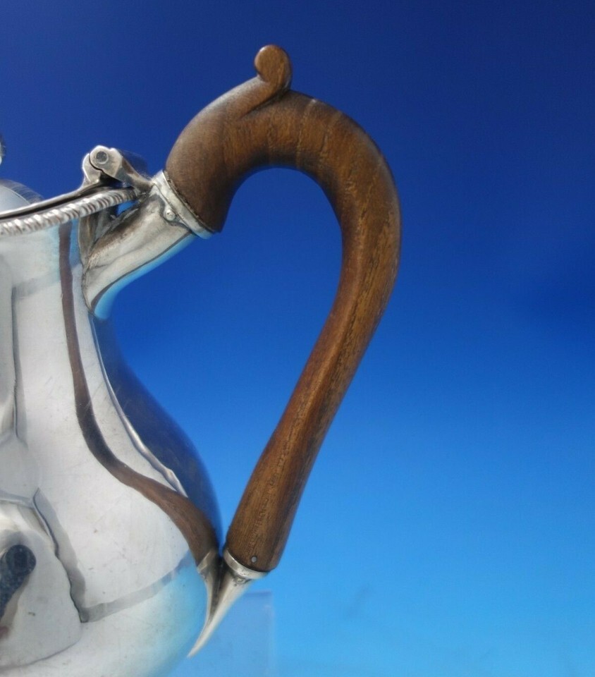 Gorgeous John Cramer sterling silver syrup pitcher / milk pitcher with wood handle and gadroon border by lid, London circa 1807. This piece measures 7" tall and weighs 17.9 troy ounces. It is not monogrammed and is in good vintage condition as shown in the photos, with minor wear to the wood as can be expected with age. Outstanding!