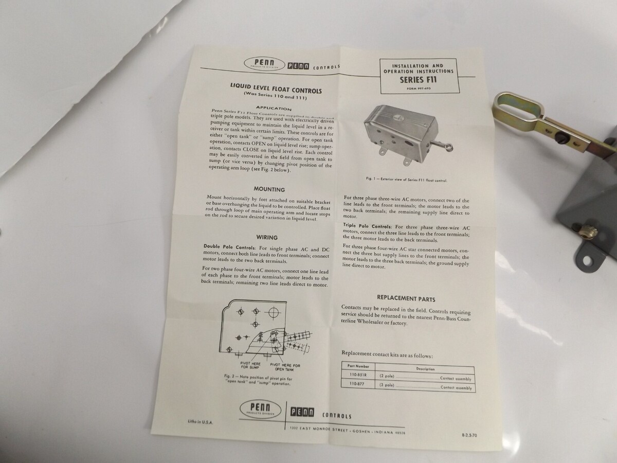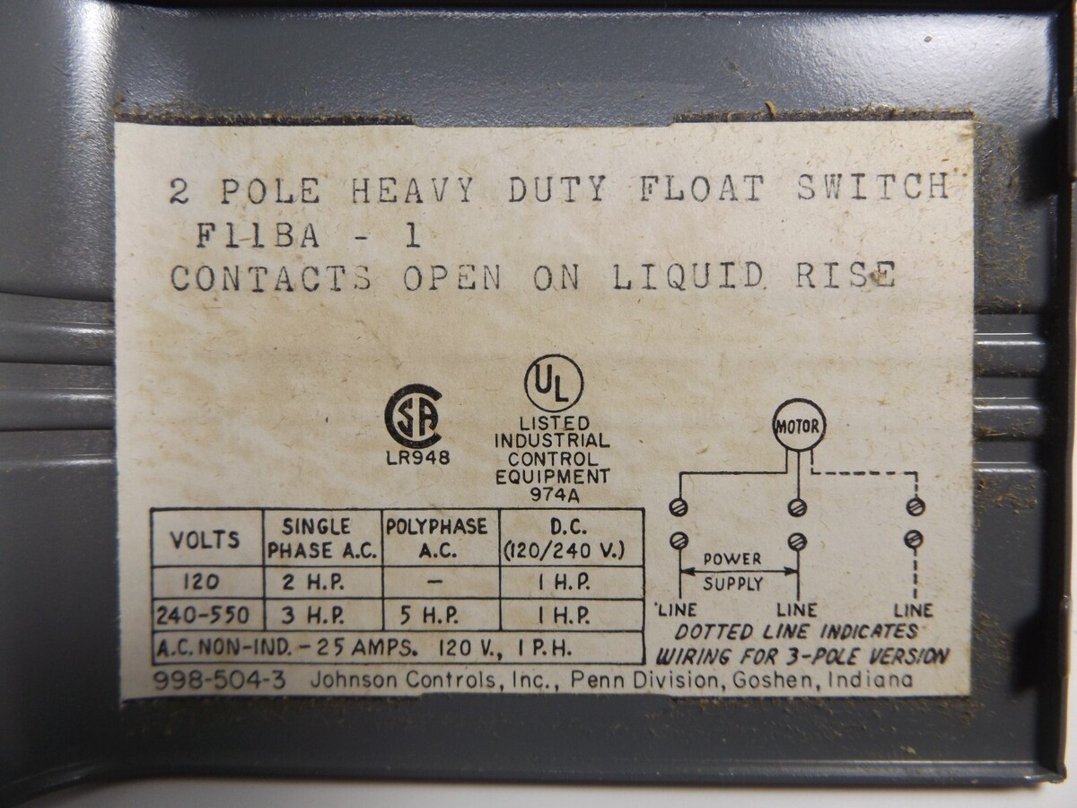 - Johnson Penn Controls 2 Pole Heavy Duty Float Switch F11BA-1 New Old Stock