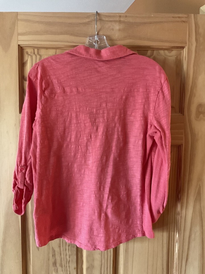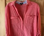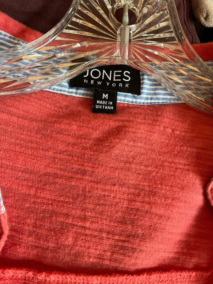 This Jones New York top is a must-have for any fashionable woman's wardrobe. The vibrant orange color and 3/4 sleeves make it a perfect choice for any occasion. The top is made of high-quality material and is available in size medium. It is a polo type top that is suitable for both casual and formal events. The brand is well-known for its stylish and comfortable clothing, and this top is no exception. Pair it with your favorite jeans or skirt, and you are ready to go.