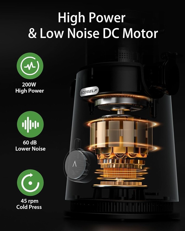 Juicer Machines with Large Feed Chute, Professional Hands Free Cold Press Juicer For Whole Fruits Vegetables, Self Feeding for Juice Extractor Machine, Easy to Clean About this item ?Wide Mouth Large Feed Chute?Our juicer features an upgraded 4.35-inch wide feed chute and 40oz capacity. Enjoy the convenience of juicing whole fruits and vegetables without pre-cutting. Designed with a space-efficient footprint, it sits neatly on any countertop without occupying excess space. Ideal for modern kitchens, its portable form allows easy movement and flexible placement wherever you need it. ?Powerful Motor Efficient High Yield?With a High-power motor, our cold press juicer separates the pulp from the juice well, providing you with better-tasting, purer juice. Cold press technology maximizes the retention of nutrients and reduces oxidation, extracting a high yield of vitamins for your satisfying juicing experience. Enjoy fruit and vegetable juices such as apple, carrot, orange, watermelon, ginger, celery, tomato and more! ?Easy to Assemble Clean?Our ECOSELF masticating juicier features a hopper screen integrated design, which can be easily assembled and disassembled in minutes, and is also easy to clean. Except for the motor base, the remaining components can be rinsed swiftly with water, and the included brush ensures a seamless cleaning process.