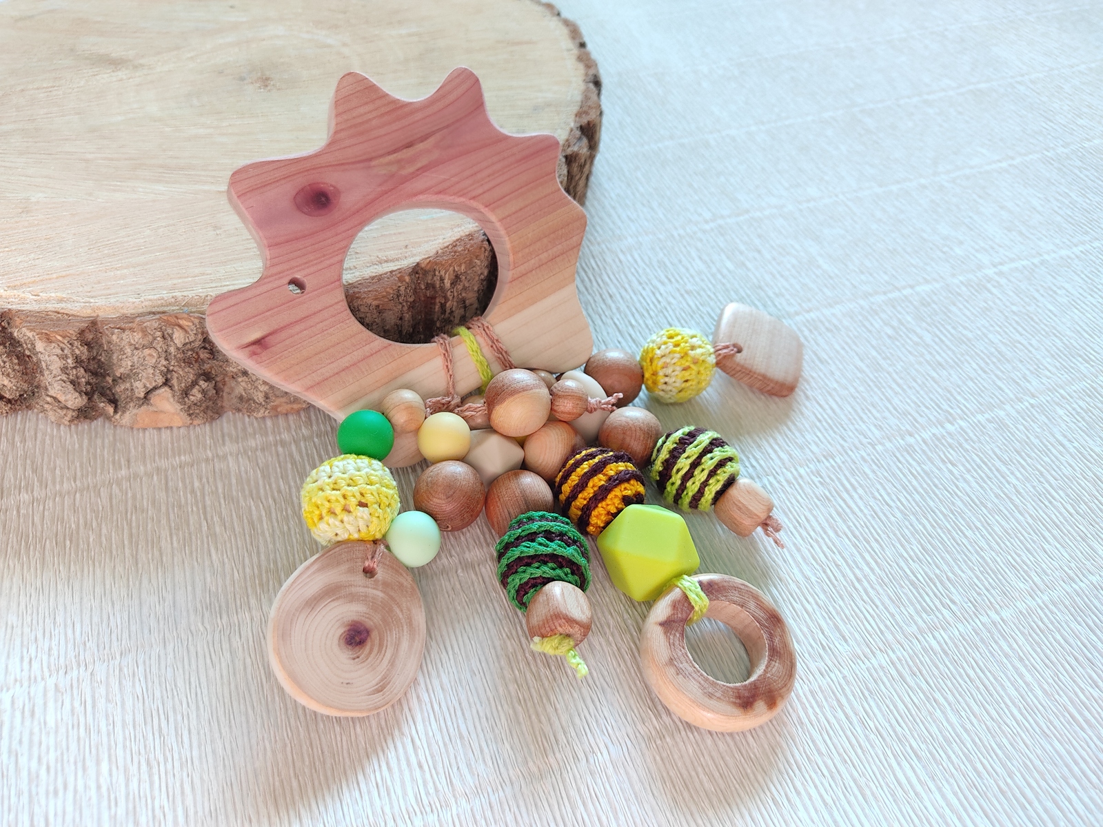 This natural, eco-friendly, organic toy is safe for baby. Crocheted beads are very textural, help to evolve baby's fine motor skills.?The toy are made from juniper. You will be charmed by its wonderful smell of the forest!The properties of juniper:Toy is juniper smell, the smell is still very long time.Juniper has bactericidal, anticeptic properties.Juniper slightly changes color on contact with waterJuniper's beads have uneven coloring. It is a natural structure of wood.