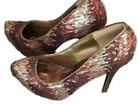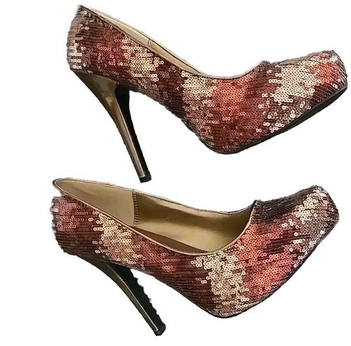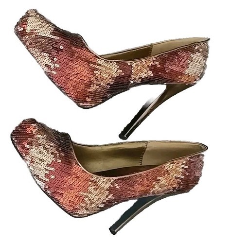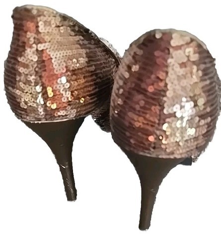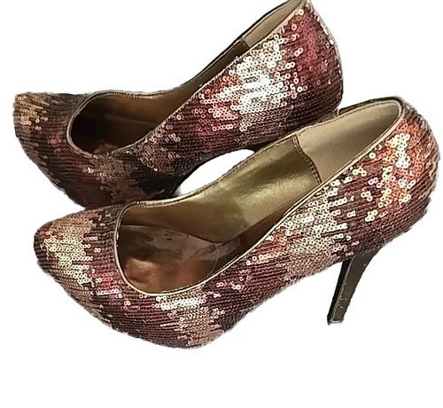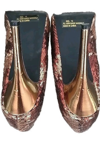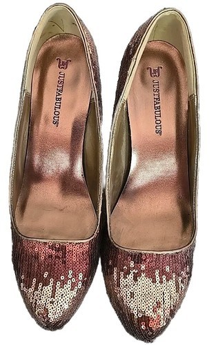 This Sale is for One (1) Pair of Just Fabulous Brand Shoes Waterfall Sequin Gold Women's Size 10 5" Stiletto Heel ~ 1.25" Hidden Platform Faux Leather Upper w/Sequins Slip on shoes Lightly padded foot-bed Sturdy platform design Man-made materials Shoes are in good ~ pre-owned condition Please view photos for a good description of these shoes Thank you!