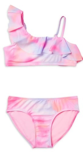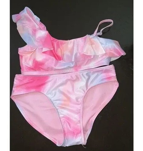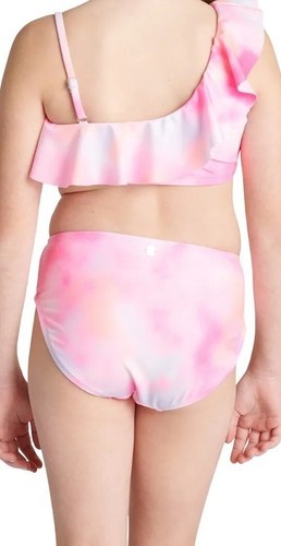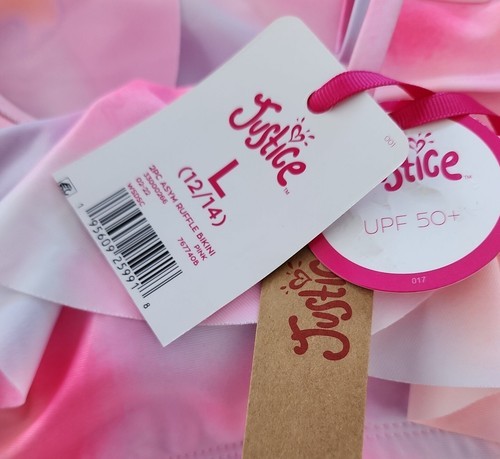 This Sale is for One (1) Justice? Swimsuit Girls' Size Large (12/14) Two (2) Piece Bikini Ruffle bikini with asymmetric strap ~ removable cups Adjustable strap Multicolored Lined 84% Recycled Polyester 16% Spandex UPF 50+ provides excellent UV protection complies with AATCC 183/ASTM D6603 Swimsuit is new with tags Please view photos for a good description of this item Thank you!