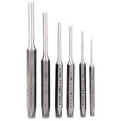 3/32", 1/8", 5/32", 3/16", 1/4", and 5/16" punches Drop forged, heat treated steel for strength and durability Striking end absorbs hammer blows Packaged in a plastic formed tray Each item is labeled with the part number for easy identification