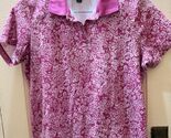 Pretty and easy to wear, this Karen Scott women?s floral polo shirt features an allover pink and white print with a classic collared neckline and short sleeves. Made from a soft 60% cotton, 40% polyester knit, it?s perfect for everyday wear, golf, or casual outings. Women?s size M with a relaxed fit and approx. 24" length (see photo with tape for reference). A great wardrobe basic from Karen Scott,