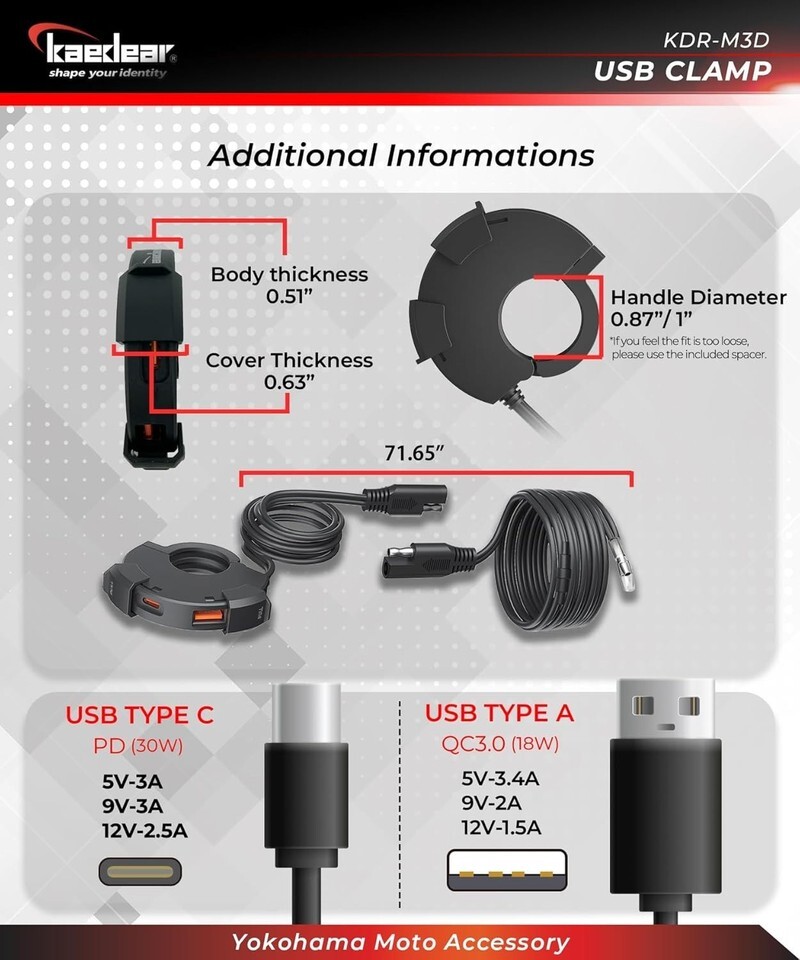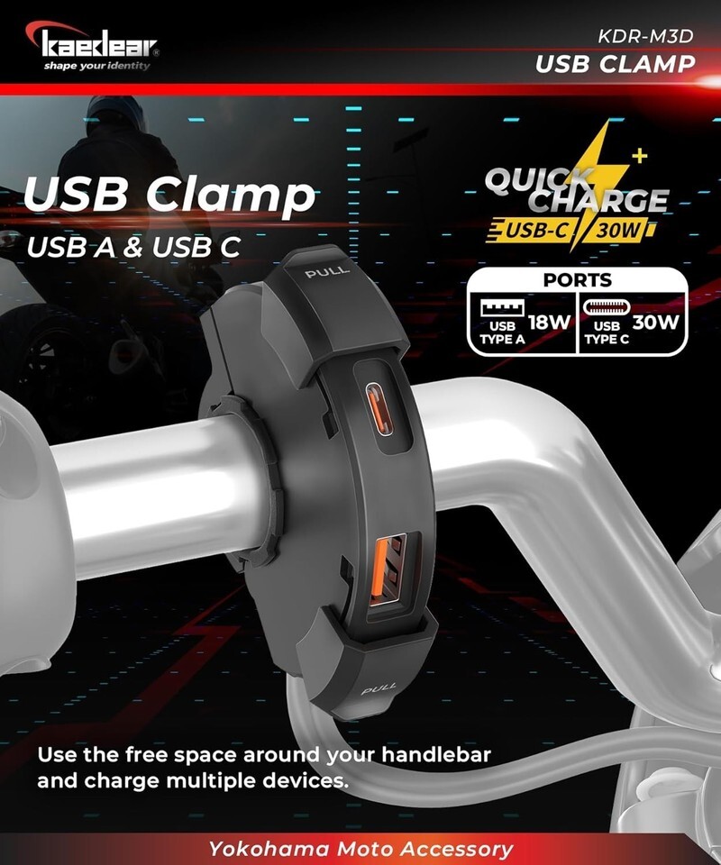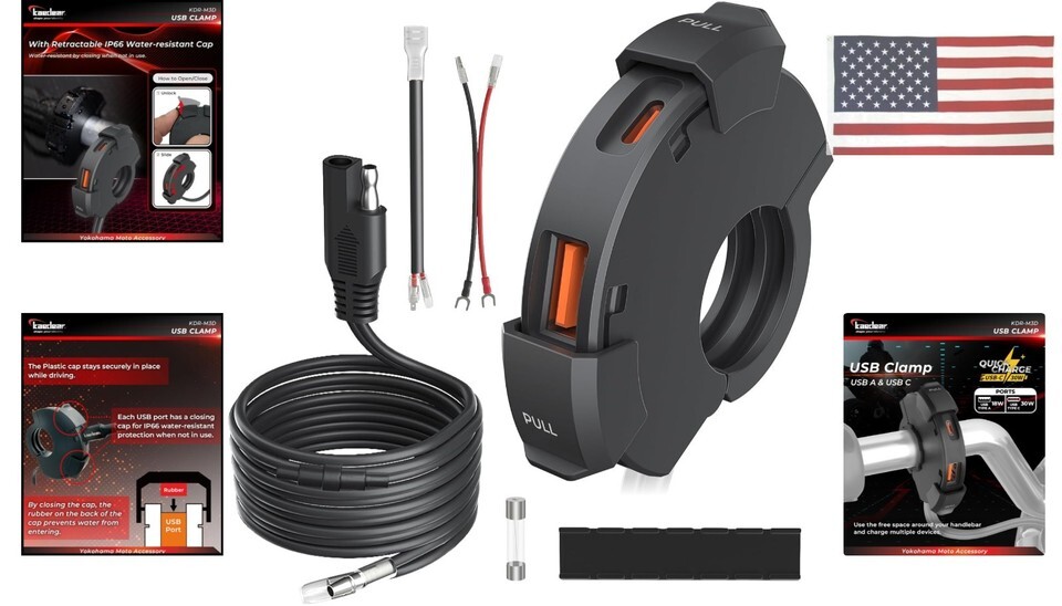 KDR-M3D Motorcycle USB 2-in-1 Clamp Charger, USB-A + USB-C PD30W + QC3.0 18W,...