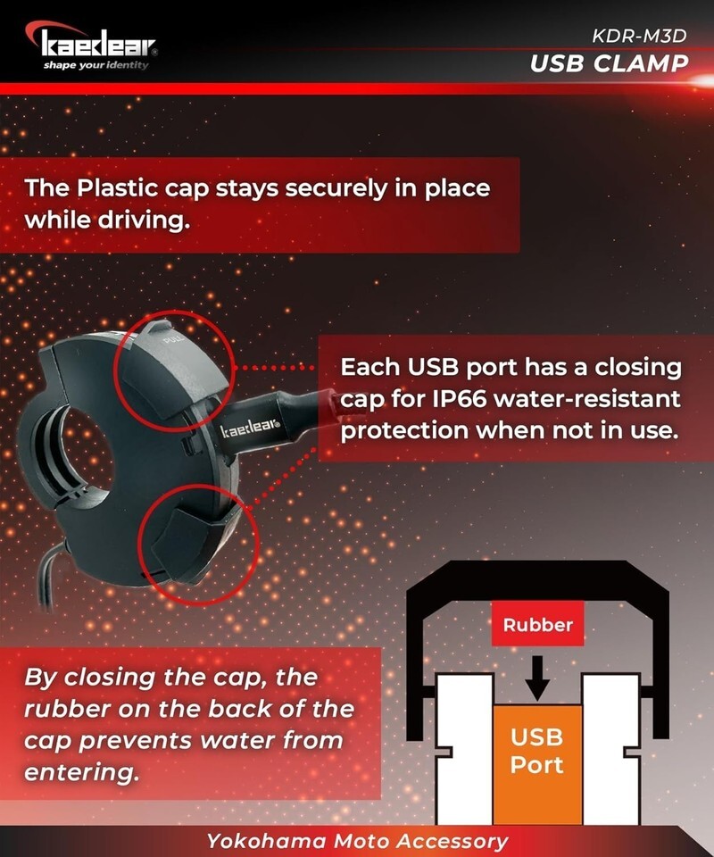 KDR-M3D Motorcycle USB 2-in-1 Clamp Charger, USB-A + USB-C PD30W + QC3.0 18W, Water Resistant, Fast Charging, SAE 12V ? ? ? ? ? ? ? ? ? ? ? ? ? ? ? ? ? ? KDR-M3D Motorcycle USB 2-in-1 Clamp Charger Elevate your riding experience with the KDR-M3D Motorcycle USB Clamp Charger, an essential companion for any adventure enthusiast. Designed with elegance and practicality in mind, this ultra-thin charging device effortlessly integrates into your motorcycle?s handlebar, ensuring you remain connected on the road. Features: Ultra-Thin Design: Lightweight body that fits effortlessly into the unused space around your handlebar. Dual Fast Charging USB Ports: Equipped with USB-A and USB-C ports, supporting QC3.0 (18W) and PD3.0 (30W) for simultaneously charging two devices. Water-Resistant: Protects internal circuits from rain and dust, enhancing the product's lifespan. Wide Compatibility: Input voltage of 12V-24V, suitable for a range of devices including iPads, iPhones, and GPS systems. Quick Installation: Effortless fitting on most motorcycle models with handlebar diameters of 22mm-25.4mm (0.866-1.0 inches). Multi-Protection: Safeguards your devices with over-current, short-circuit, overheating, and overpower protections. Manufacturer?s : Enjoy a 1- and continuous support from our dedicated customer service team. Benefits: Efficient charging on the go ? never miss capturing that perfect moment. Durable design withstands harsh weather, ensuring reliability during your rides. Seamless integration into your motorcycle's aesthetic. Safe and efficient, giving you peace of mind while you focus on the ride. Customer-centric support, ready to assist you with any concerns. Why Choose KDR-M3D? Stay powered on your journey with the KDR-M3D Motorcycle USB Clamp Charger. Its dual fast-charging capabilities and robust design make it the premier choice for motorcycle enthusiasts aiming to enhance their rides. Experience the fusion of functionality, safety, and elegance?your devices deserve nothing less. Don't let low battery notifications spoil your adventures. Order your KDR-M3D today and give your motorcycle the upgrade it deserves! Shipping Free Fast Shipping - We offer free shipping to most of the USA with a normal delivery time of 3-7 days. However, due to the current situation, additional delivery time (up to 3 weeks) may be required for some items. Alternative Carriers - We may use alternative carriers (e.g. USPS, FedEx, UPS, etc.) to ensure your package arrives safely and on time. Due to the use of multiple carriers, we are unable to provide a tracking number automatically. Handling Time - Orders are processed and shipped within 1-2 business days of receiving cleared payment. Shipping Restrictions - Shipping to Alaska, Hawaii, Puerto Rico, Guam, and other US territories may incur shipping charges or delivery restrictions. Please contact us before ordering, or your order can be refunded/cancelled. State Restrictions - There may be restrictions based on your state of purchase. For example, certain items may not be shipped to California due to state regulations. Contact for Tracking Updates - If you require tracking updates or have any concerns about the delivery of your order, please feel free to contact us, and we will be happy to assist you. Return 30-Day Hassle-Free Returns - We want you to be completely satisfied with your purchase. If you are not, you can return the item within 30 days of receiving it for a full refund or exchange. Easy Return Process - To start a return, simply contact us and we will provide you with a prepaid return shipping label and detailed instructions. Restocking Fee - There are no restocking fees for returns. However, the buyer is responsible for return shipping costs if the return is not due to a seller's error. Refund Processing Time - Refunds will be processed within 5 business days of receiving the returned item in its condition. Payment We accept all major credit cards, PayPal, and Apple Pay for your convenience. Your payment information is secure and encrypted to ensure a safe and seamless transaction. Please complete your payment within 3 days of purchase to avoid any delays in shipping. Feedback Your feedback is extremely important to us. We strive to provide the best products and customer service possible. If you are satisfied with your purchase, please take a moment to leave us a positive review. If you have any concerns or issues with your order, please contact us before leaving negative feedback. We are committed to resolving any problems and ensuring your satisfaction. Contact Us If you have any questions or concerns, please feel free to out to our customer support team. You can contact us through the messaging system. We are available Monday to Friday, 9:00 am to 5:00 pm EST, and we will do our best to respond to your inquiry within 24 hours. Buy it now and enjoy a pleasant shopping experience! UPC: 743829431562 Item Weight: 4.8 ounces Unit Quantity: 1 Connectivity: Does not apply Items Included: USB clamp (main unit),22mm spacer,fuse,power connector cables,m3*8 bolt/nut,user manual Mounting Location: Handlebar Compatible Brand: Does not apply Compatible Model: Does not apply Design/Finish: Does not apply MPN: M11A Features: Lightweight,Fast Charging,Water Resistant,Multi-Protection Theme: Does not apply Type: USB Charger Number of Ports: 2 Color: USB-A + USB C Voltage: 12 V Mounting Type: Handlebar Clamp