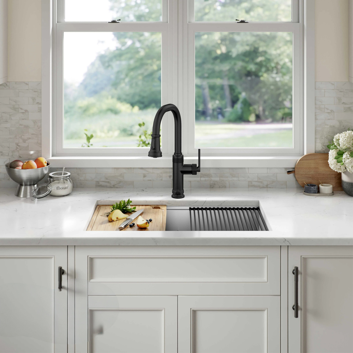 Its integrated workstation ledge allows you to slide accessories across the sink for seamless food prep, while the deep single bowl provides ample space for large cookware. A satin finish, sound-dampening technology, and heat- and stain-resistant construction ensure a quiet, clean, and sleek kitchen environment.