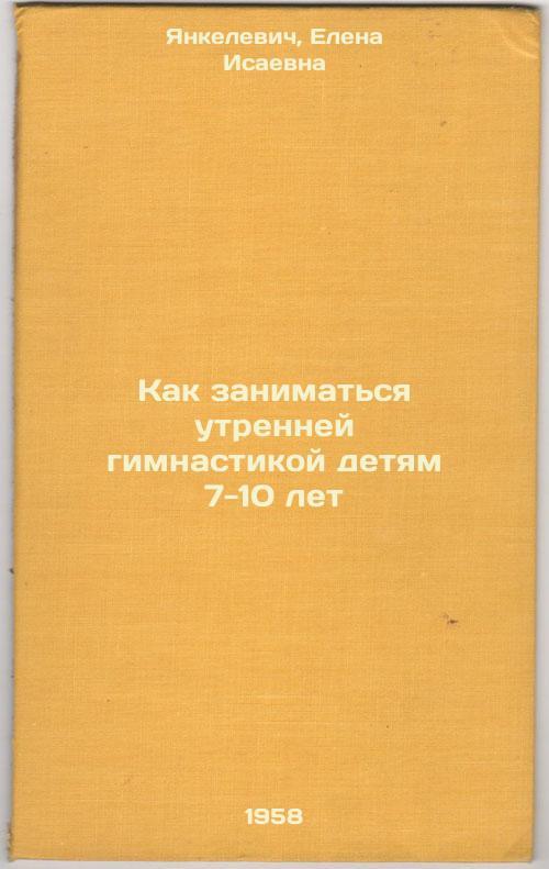 Short description: In Russian. Yankelevich, Elena Isaevna. How to practice morning gymnastics for children 7-10 years old. Moscow: Medgiz, 1958. Kak zanimat'sya utrenney gimnastikoy detyam 7-10 let. In Russian /How to do morning gymnastics for children 7-10 years old . The image is provided for reference only. It may reflect condition of one of the available copies or only help in identifying the edition. Please feel free to contact us for a detailed description of the copies available. SKU6366876
