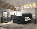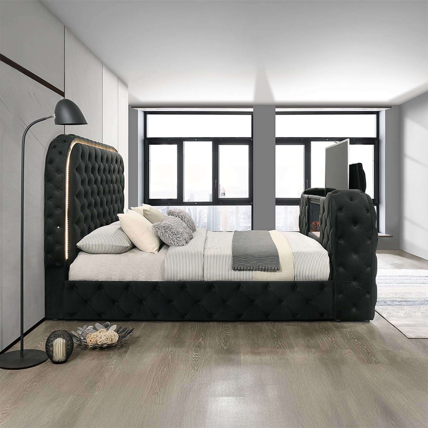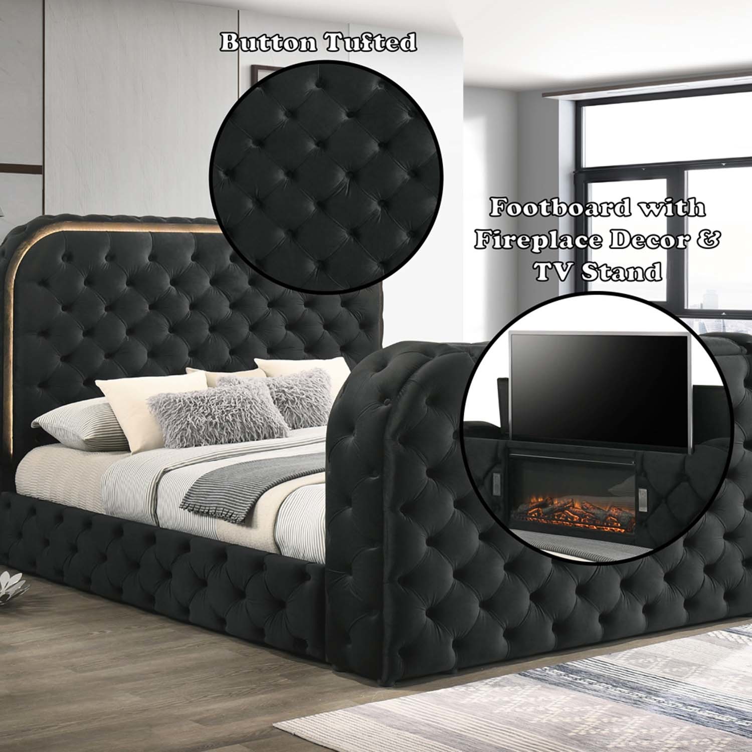 - Kana Queen Bed w/LED, Fireplace & TV Stand, Black Upholstery Velvet