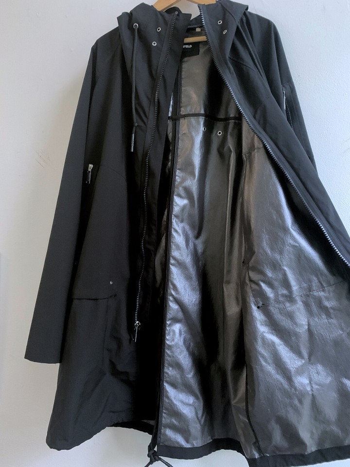Stylish Pre-owned Karl Lagerfeld Lightweight oversized mod style coat with hood and zippered pockets. This coat is in excellent condition and is XL Tall Guy (XLTG) sized.